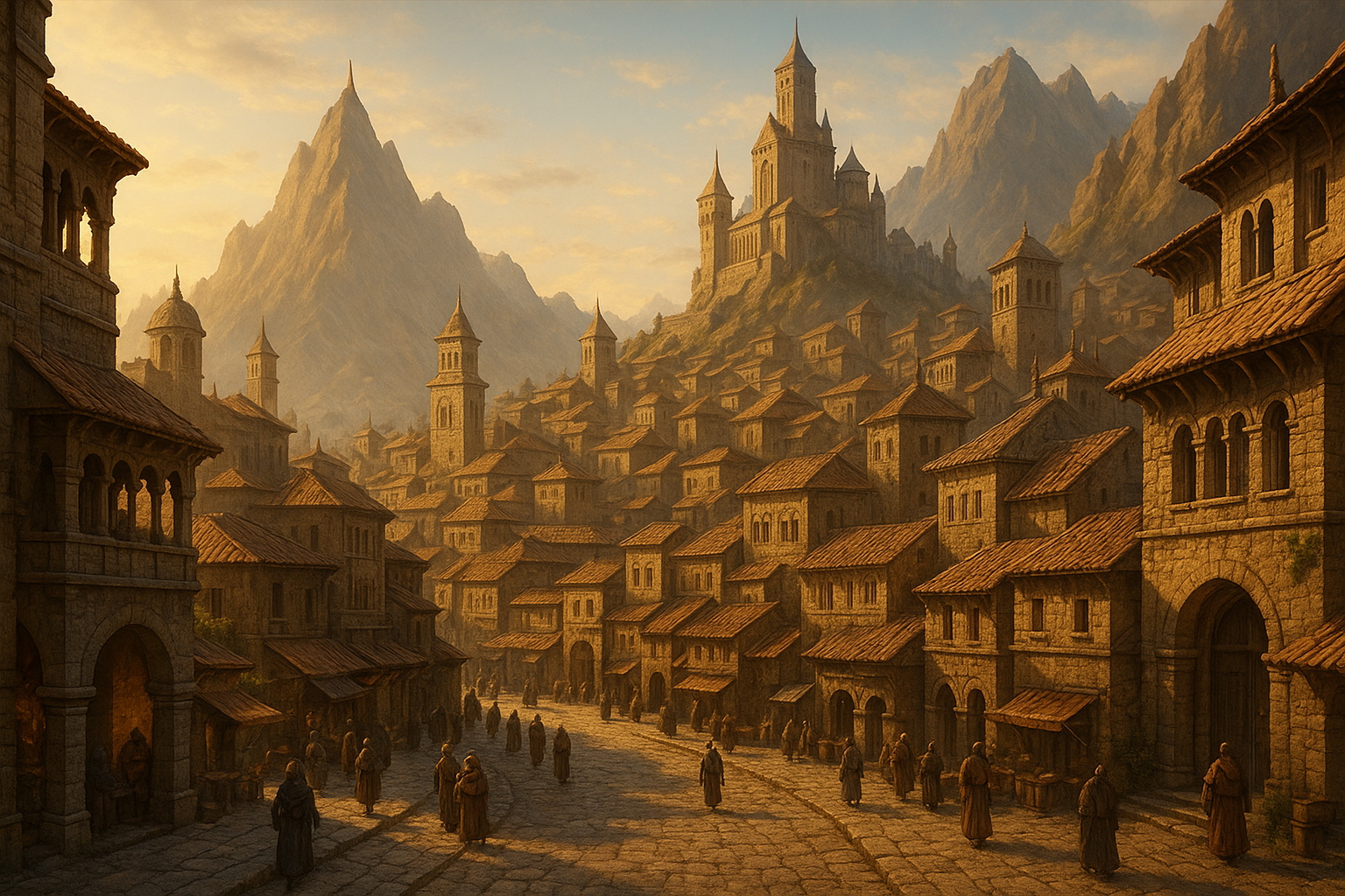Over decades, this camp hardened into a permanent settlement; stone replaced canvas, sinns replaced tents, a steady river of pilgrims demanded food, shelter, healers, and artisans. Merchants realized the potential and established permanent stalls. The first walls rose not to defend the town, but to prevent caravans from being swept away by mountain winds and winter flash floods.