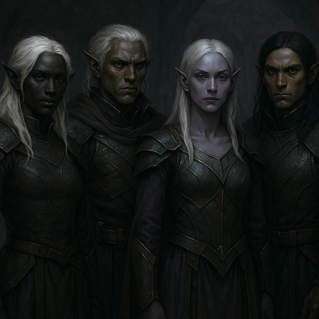 As their civilization grew, philosophical divisions took root within their society, culminating in the political schism known as the Fracture of the Houses. Some Houses sought deeper isolation and absolute self-sufficiency, believing the surface world posed too great a threat. Others advocated cautious engagement and trade with surface nations. A smaller, more radical faction interpreted Vethira’s teachings through a lens of domination rather than harmony, claiming that strength was proven through control. Their methods—ruthless ambition, ritual coercion, and weaponized shadowcraft—led to their eventual expulsion. Yet their exile created a lasting wound: this splinter faction would evolve into the feared extremist sect that surface peoples later mistook as representative of all dark elves. The stigma remains a source of tension to this day.