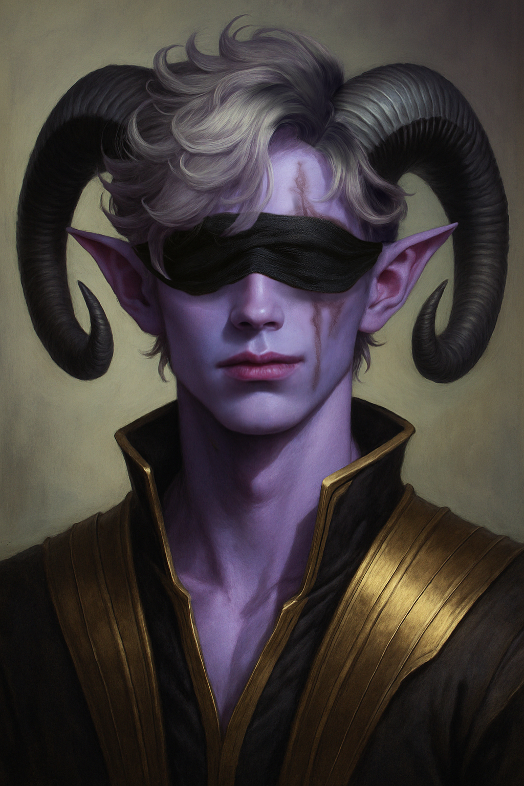 Silas is a half-demon (Cambion) with pale lavender skin, small black curled ram’s horns, and striking black-to-silvery-white gradient hair. His most defining feature is the golden blindfold covering his eyes, a remnant of the brutal punishment he endured at the hands of Countess Audrey Atlee. Though blind, he moves with confidence, relying on his heightened senses, his spade-tipped tail, and a staff for navigation.
