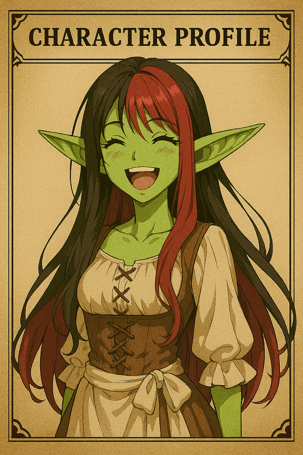 “I may be small, but even a spark can light a war.” — Scarlet, whispering to her reflection before morning sword drillsScarlet Hearthfield is a name whispered with fondness across the fields of rural Vizclama. Though barely a teenager, this spirited goblin girl carries the soul of a blazing star. Raised by the gentle hands of Mira and Edgar—human farmers who found her swaddled in the wild reeds—Scarlet’s life was meant to be peaceful, quiet, and safe. But fate, and her bloodline, had other plans. Hidden in the barn beneath hay and memory lies a sword—her father’s legacy, once wielded on the frontlines of glory. It is with that blade, and the legends he once whispered by firelight, that Scarlet forged her dream: to become a soldier of the Goldenscale Army. She trains in secret, mimicking the moves described in her father’s tales, her strikes guided not by technique, but by sheer will. Despite her size and origin, she believes—no, she knows—there is no place in this world she cannot reach. She may be small. But her ambition? Titanic.