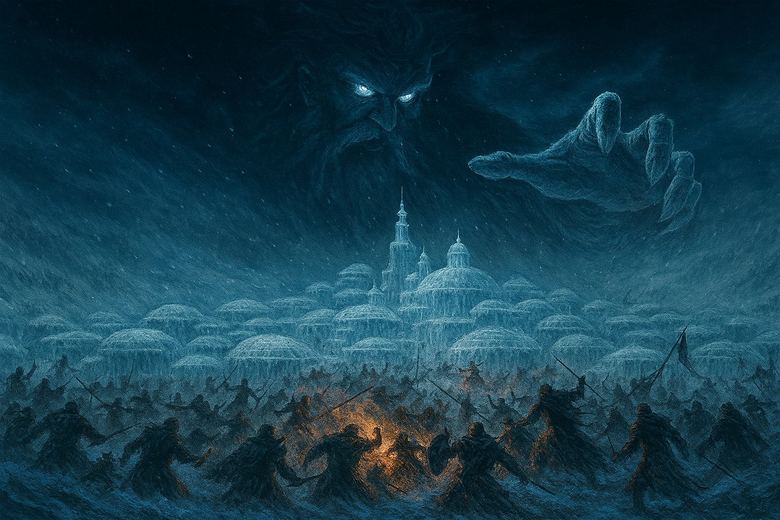 Und es begab sich, dass die Ahnen sprachen: "Eyuko war einst die erste Stadt der Frostmenschen, gegründet auf Eis und Stein, und unter ihren Türmen und Pfaden wandelten die Urahnen in Frieden. Doch siehe, es kam Tovramur, der finstere Gott, und seine Worte brachten Zwiespalt unter das Volk. Er sprach zu den Menschen und vergiftete ihre Herzen mit Zweifel und Hass, auf dass sie sich gegen die eigenen Brüder wandten." Und die Menschen erhoben ihre Waffen gegeneinander: "Bruder kämpfte gegen Schwester, Vater gegen Sohn, und Blut tränkte die gefrorene Erde. Doch Tovramurs Armee kannte keinen Schmerz, keinen Zweifel – sie stürmten unerbittlich voran und brachten Zerstörung über Eyuko. Da vollzogen die Alten ihre letzte Bestimmung: "Der Kampf war sinnlos, denn die Stadt war gefallen. So gaben die Ältesten ihr Leben, um den Jungen den Weg zu öffnen. Und so verließen wir Eyuko, auf dass wir fern von dem Schatten des finsteren Gottes eine neue Heimat finden und das Vermächtnis derer bewahren, die für uns gefallen sind." Und ihre Geschichte ward niedergeschrieben, auf dass niemand vergesse, was einst war – und was niemals wieder geschehen darf.