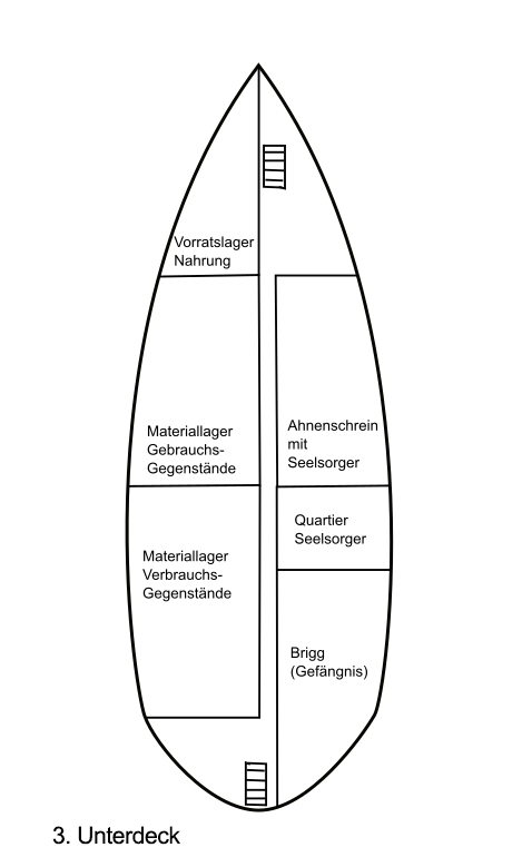 Zwei Treppenaufgänge an Bug und Heck verbinden das Deck mit den darüberliegenden Ebenen und ermöglichen schnellen Zugang zu allen Funktionsbereichen. Das dritte Unterdeck ist so strukturiert, dass Lagerhaltung, rituelle Betreuung und Sicherheitsaufgaben effizient auf engem Raum vereint sind.