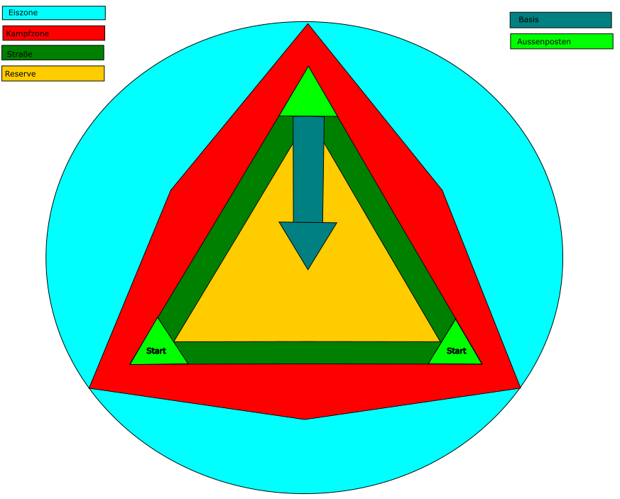 Läufer auf Außenposten dürfen nicht angegriffen werden. Die Start-Außenposten können frei gewählt werden. Es ist erlaubt, den langen Weg zu gehen (über beide Start-Außenposten). Es darf sich immer nur 1 Spieler auf einem Außenposten befinden.Kampfbereich