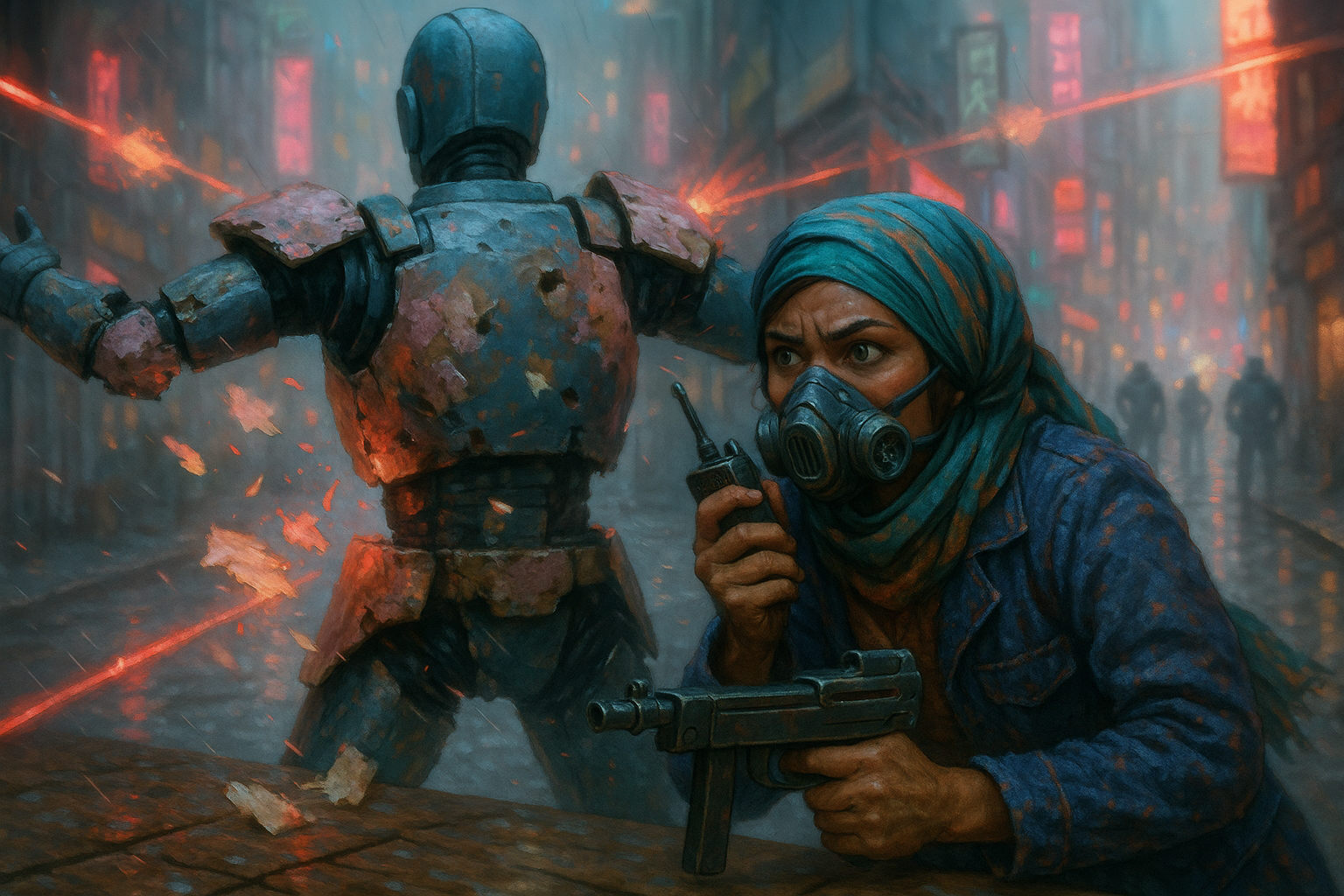 Improvised Weaponry: Industrial tools turned to violence—momentum-amplifying hammers, chemical solvents weaponized into crude gas attacks, or cargo haulers converted into cataphracts.