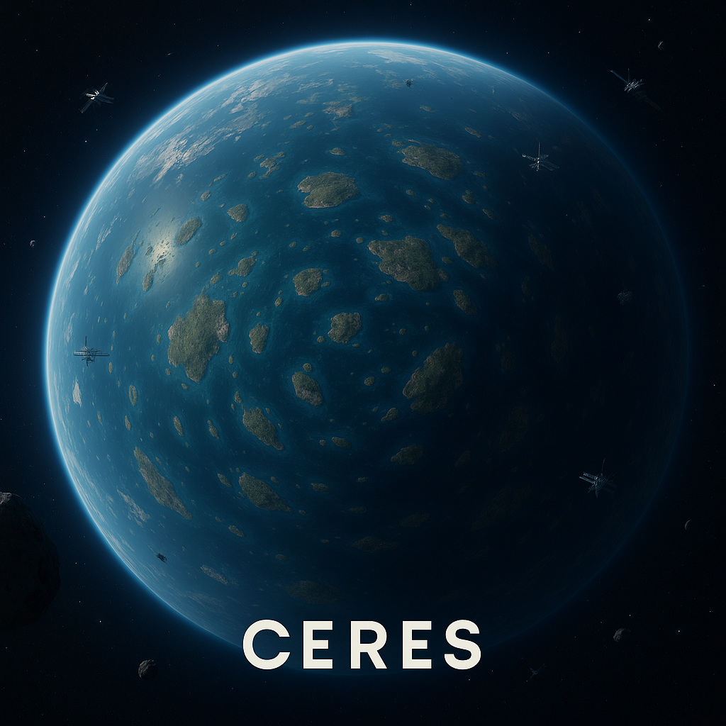 Ceres is the financial heart of the Pan-Solar Consortium, a dwarf planet transformed from barren ice and rock into a living oceanic world. Its surface is covered almost entirely by saltwater seas, dotted with small island chains that once were mountain peaks or asteroids deliberately pressed down into place. Above it hang orbital pressors that regulate climate, provide artificial sunlight, and generate surface gravity close to Earth normal. These same systems also sweep away errant asteroids and enforce an exospheric shield, making unauthorized approach nearly impossible.