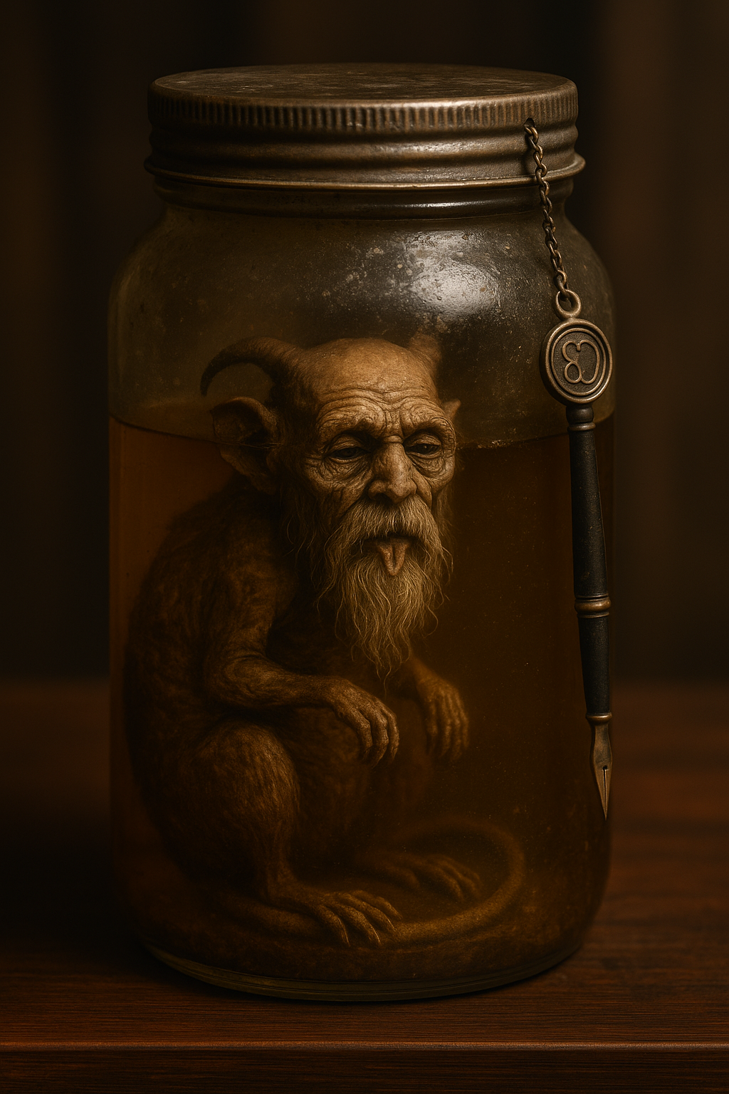 It was a grimy jar, almost opaque with filth, and what sat inside would have been mistaken for some genetic experiment gone wrong or a taxidermist's sick joke. It had the appearance of a large brown rat, but its head resembled a grizzled old man complete with a long beard and receding hairline. There was something uncanny about the face that had nothing to do with its ancient, mummified state. The eyes were too wide-set or the face was too long even under the beard. Where dry lips had receded, its teeth were more ratlike than human, with a dusty forked tongue clenched between a double row of dry yellow fangs.