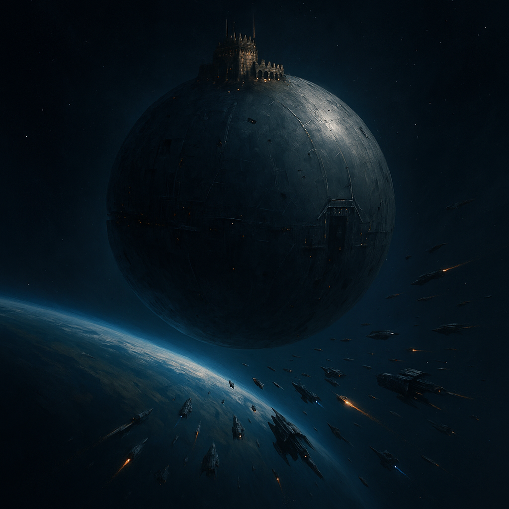 Dysnomia, Eris’s largest moon, has been transformed into a fortress-laboratory of staggering proportions. Its surface is sealed beneath an artificial shell studded with weapons, sensors, and torpedo bays. Beneath that shell lies a world of tunnels, foundries, barracks, and laboratories — a self-contained engine of war and control. The outer layer bristles with enough sensory Equipment to monitor half the Solar System, while its batteries and drone swarms make approach a suicidal gamble.