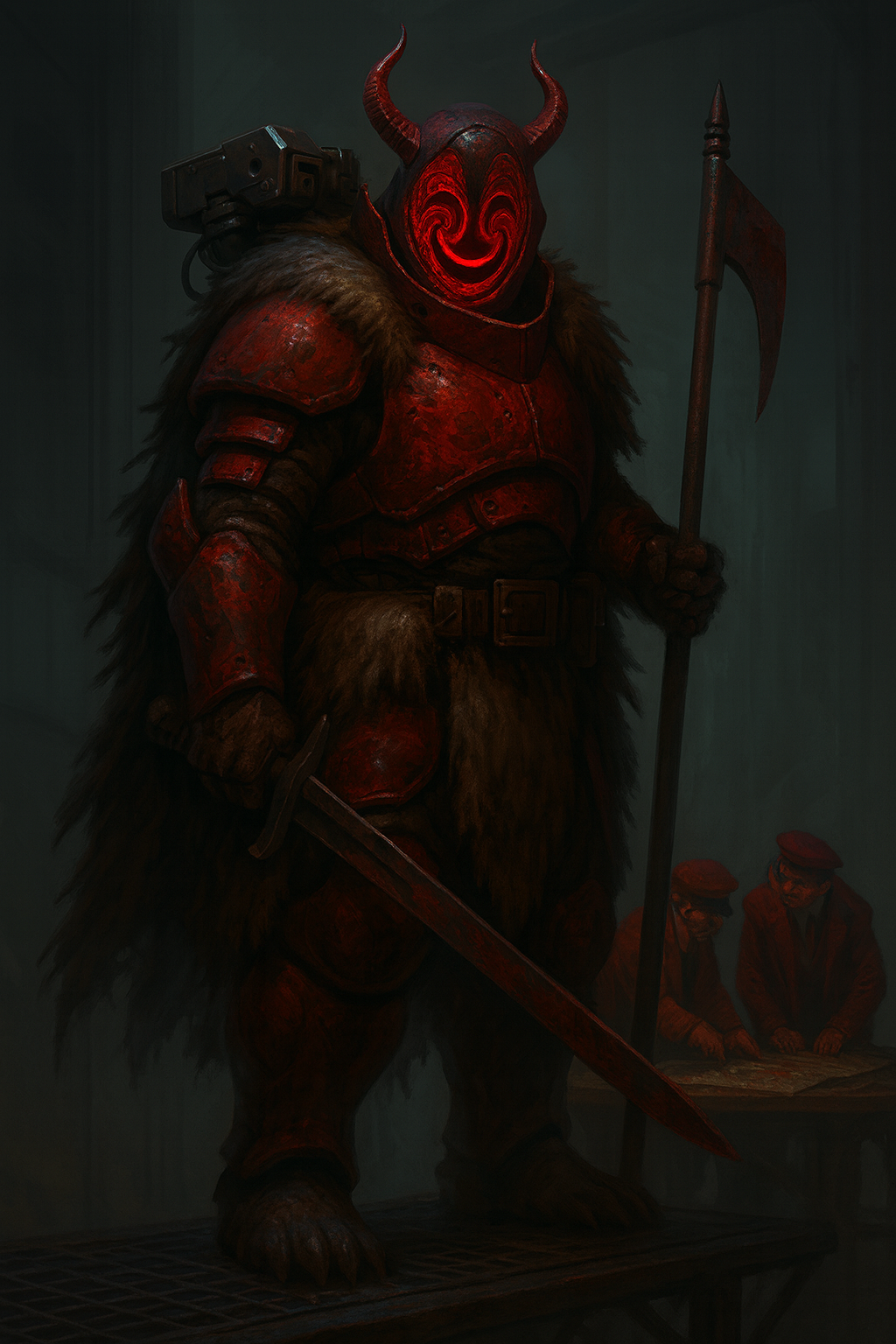 The Monster’s armor is a work of both function and theater. Constructed of advanced composites and powered systems, it is deliberately decorated to exaggerate her bulk, twisting her silhouette just far enough past human identifiers to set primal instincts on edge. The faceplate is the most infamous feature: a leering, spiral-twisted visage modeled after Yupik masks, its maw lined with shark-tooth shapes in perpetual grin. From the outside, the mouth and eyes emit an eerie red glow, or—more terrifyingly—flicker with an IR beam matrix that tracks motion even in perfect darkness. Within, the holographic display overlays combat telemetry, predictive targeting arcs, and the layered vision of microwave through X-ray bands, turning the world into a shifting lattice of ghostly detail.