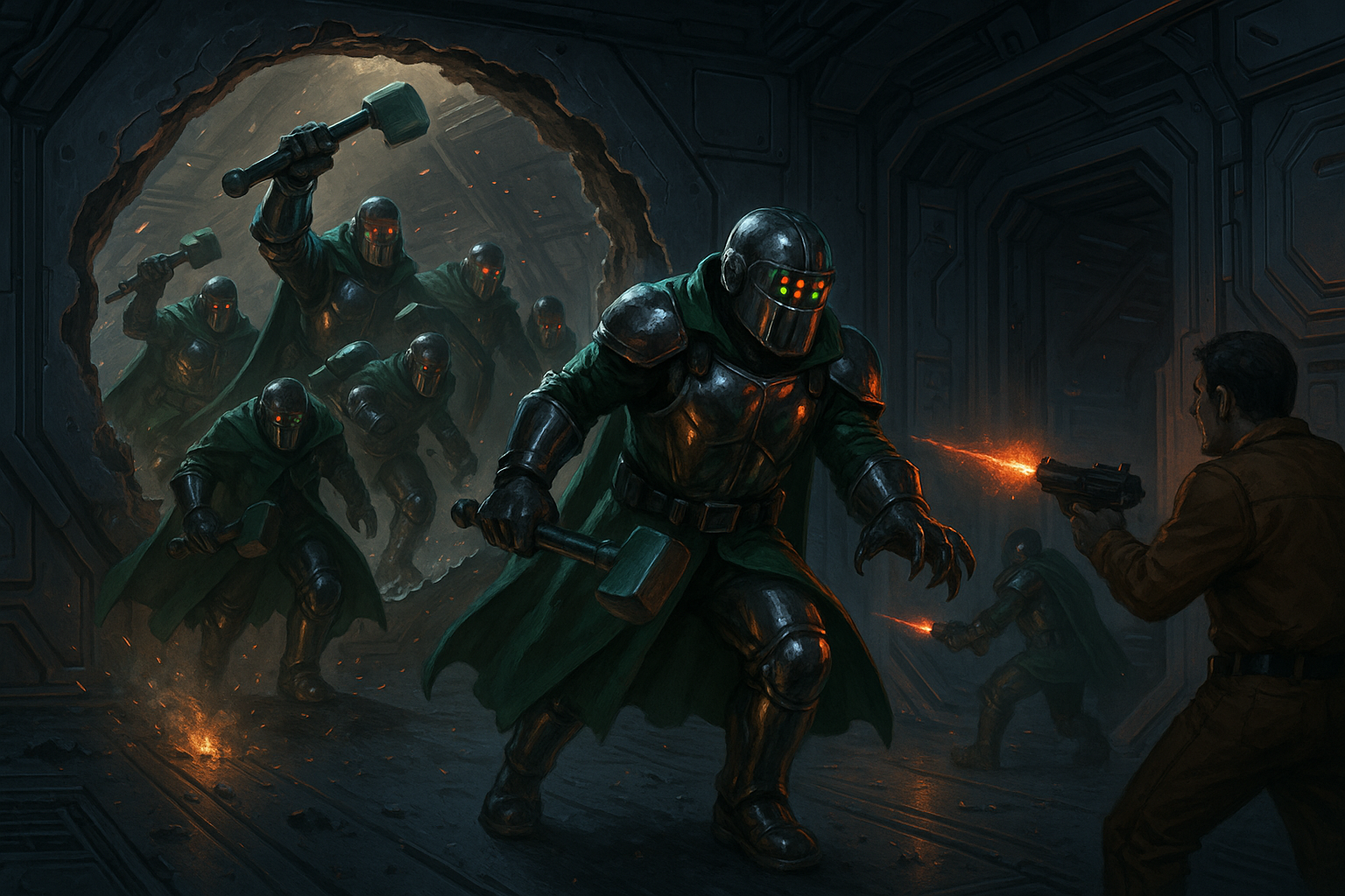 In combat, Our Turn Trogs prefer shock over subtlety. When fighting openly, they wear chromed combat armor polished to a mirror finish and distinctive green longcoats, with gauntlets tipped in claws and faceplates lit by erratic blinking red-and-green LEDs. Their preferred weapons are momentum-amplifying hammers or electron-sheathe batons—close-combat tools suited to their tremendous physical strength and meant to offset their notoriously poor marksmanship.