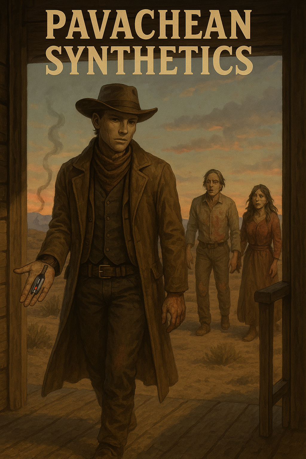 The people of Pavacho argue endlessly over the Synthetics’ origin. Some say they are weapons of House Volkert, sent to destabilize Pavacho with paranoia and undead terror. Others whisper of forgotten Commonwealth experiments, or even alien infiltration. The most unnerving theory is that the synthetics are not “agents” at all — that they are field tests for something still greater. What is certain is that Pavacho’s sheriff and bounty hunters now treat every stranger with suspicion, knowing that the next outlaw duel may end with their opponent shedding skin to reveal steel, and the dead rising around them under a puppet master’s command.