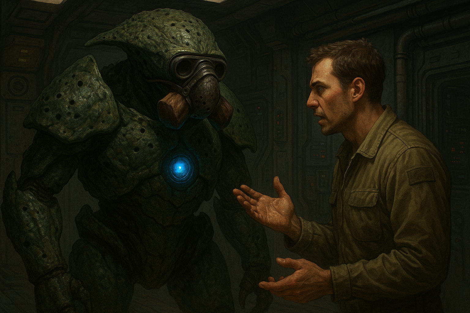 “They’re good neighbors, really. They don’t sleep, don’t eat, don’t talk much. You can walk for miles across their coral forests—great, green things humming softly in the wind—and know that every root, every shimmer in the sand, is thinking. They don’t build cities the way we do. They just… grow them. And if you listen closely, you can hear their hearts—zzigzzaagzzigzzaag—like the planet itself is alive.”