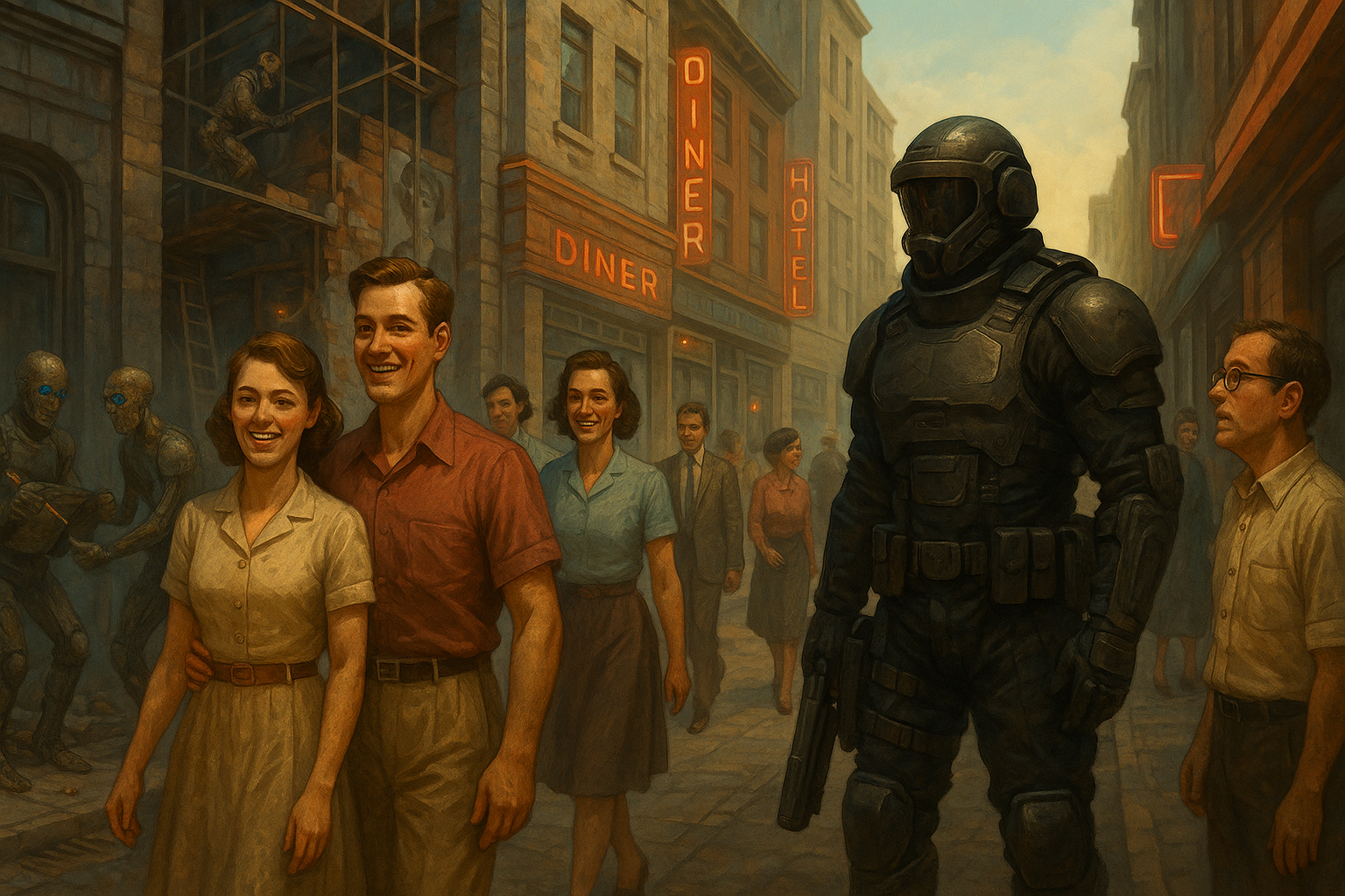 "It’s a strange place, Rome. You’ll see families in clean jumpsuits sipping coffee on neon-lit balconies, then walk three blocks and find a man nerve-stapled and marched off like it’s nothing. Everyone’s polite, but it’s not decency—it’s terror, dressed up in civility."