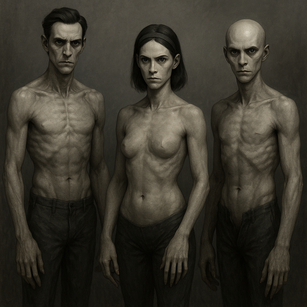 Wights are the closest thing Redspace has to a “people.” Unlike the bestial Vermin or the vice-elemental Tertia with exotic geometries, Wights appear humanoid. They stand between 1.3 and 1.8 meters tall on average, with smooth gray skin, featureless or nearly featureless noses, thin or absent lips, and unsettlingly consistent musculature. Their bodies contain organs, fluids, fascia, and nerves—but these systems function according to subspace logic, not biological evolution. Any realspace anatomist attempting dissection finds a plausible internal structure that nevertheless makes no physical sense.