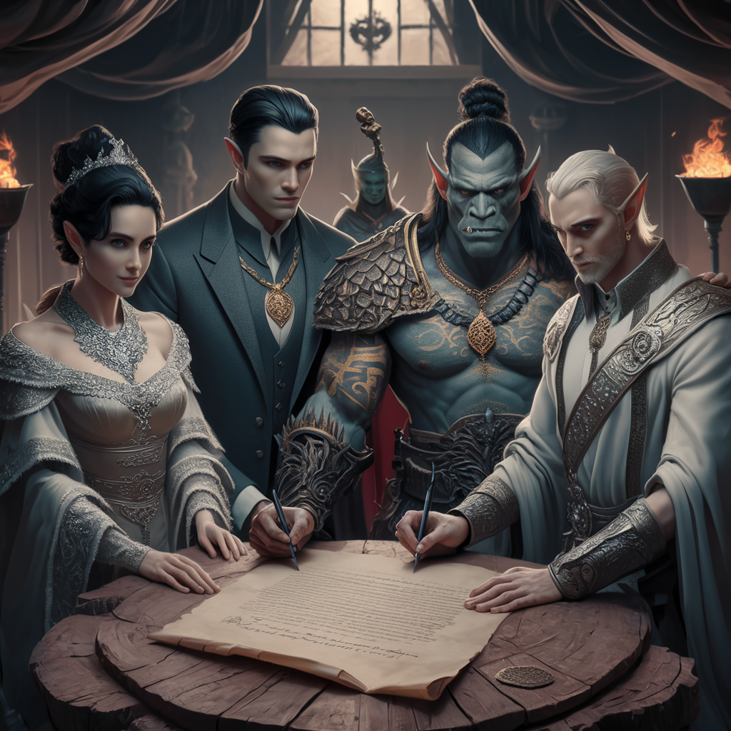 Under the treaty, the rulers of each kingdom—Aranethil Starleaf of Mountainrun, Grak'Thor Bloodfang of Steerbright, Desmond Koffre of Nunca, and Lady Serilda Ironhelm of Shatterbleak—pledged their allegiance to the greater good of the realm. Bound by their shared victory against darkness, they vowed to protect their lands, foster prosperity, and maintain the delicate balance of power that held the Ancient Reach together.