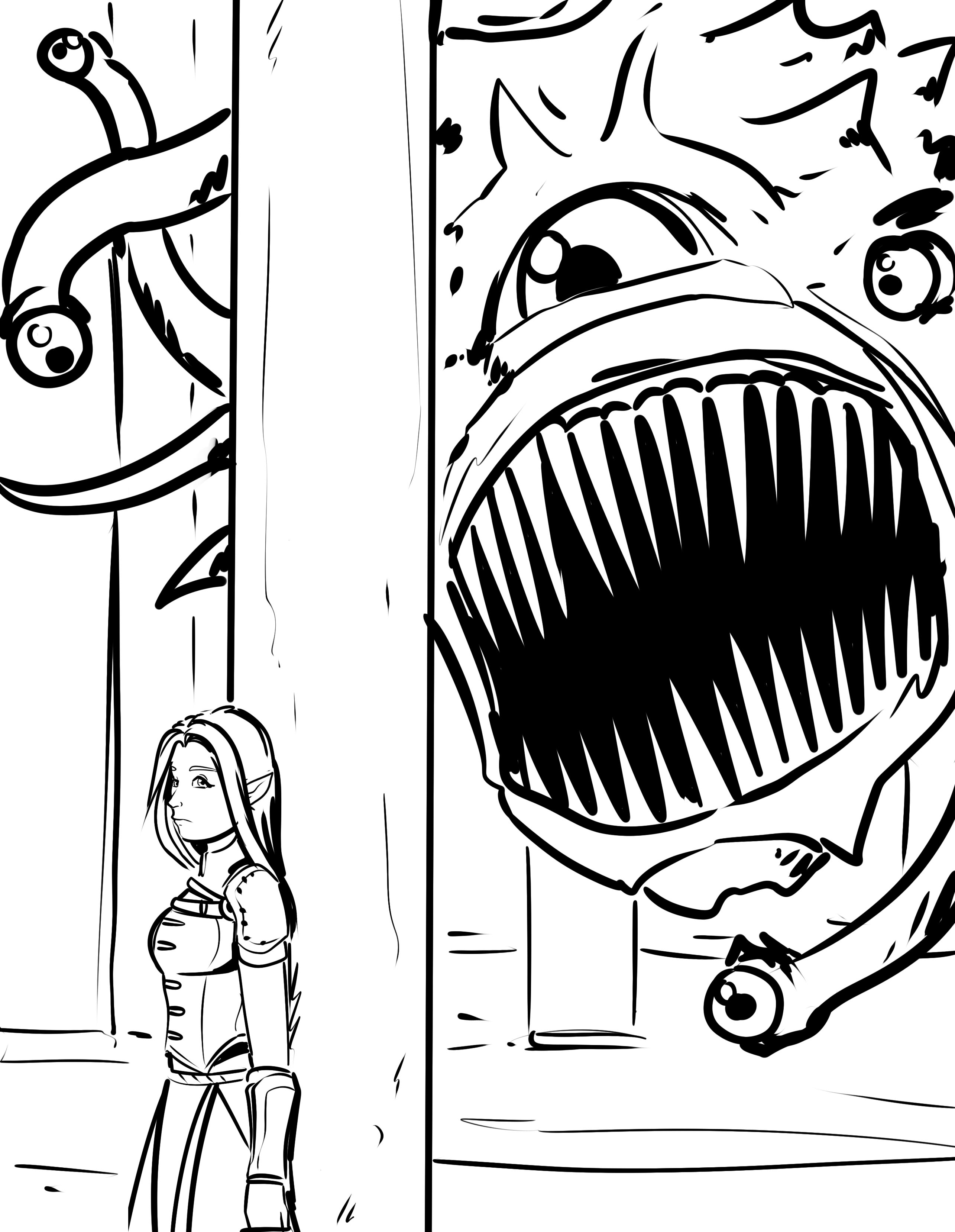 It idly floated over to its treasure hoard, angrily muttering to itself. Sariel dared a glance around the column, watching it look through its belongings. If her heart leapt when the aberration had returned early to its lair, it stopped when the beholder's mutterings ceased.