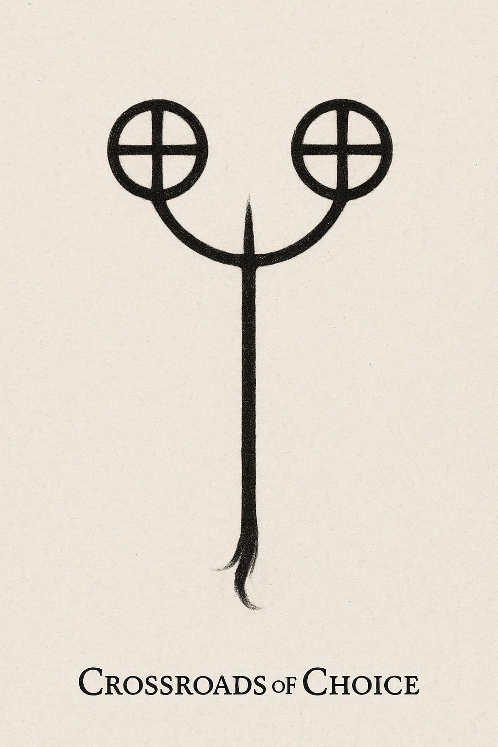 The Forked Path: An abstract sigil representing the cosmic truth of choice. It is the map of the crossroads, a reminder that from one truth, many paths emerge.
