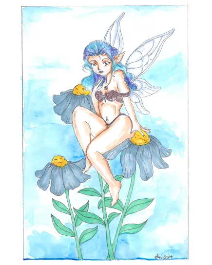 By noon, she had at least eaten, and Drax had settled near her easel. She stared at the fairy she had been painting, her brush dipping into cerulean blue as she worked on the delicate petals. The fairy was a commissioned piece from a friend—a character named Seraphina, a little spitfire she had once played in a tabletop game with her friends. The fairy stuck out on the paper among the blue flowers she had sketched in.