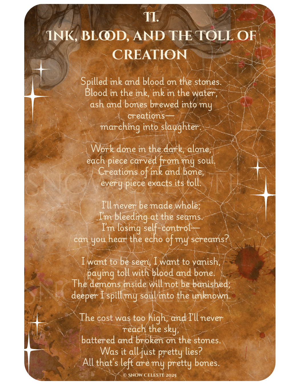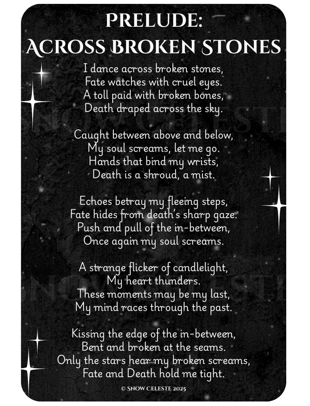 This is a hymn for those who bargain with shadows, a liturgy stitched in ink, bone, and desire. Between Fate’s cruel hand, Death’s embrace, and the Muse’s unrelenting hunger, the soul is torn and remade — a dance in the in-between, where creation is both sacrifice and salvation. Structured as a prelude and three movements, this work traces a soul’s journey from fragmentation, through sacrifice, to fragile restoration. At its heart lies a meditation on the toll of desire and the cost of art.