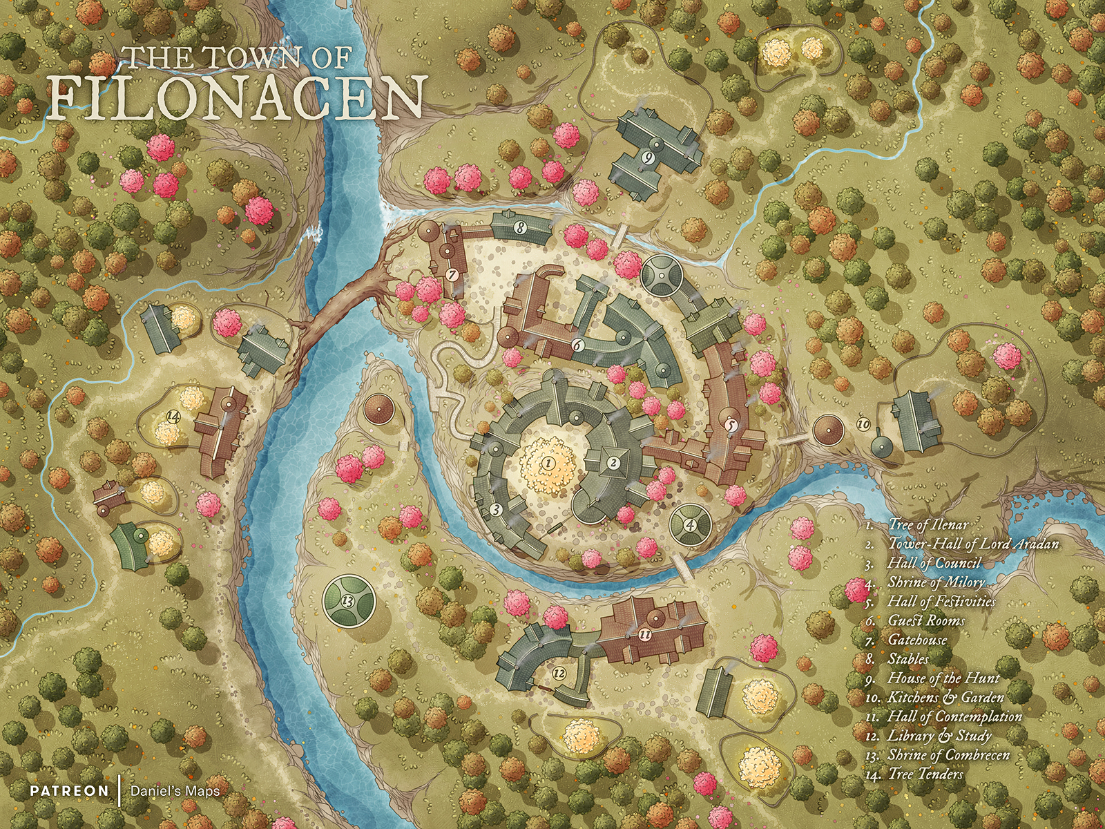 Filonacen, the house of Elven-Lord Aradan, lies in the northern stretches of the Angensi Woods and is the southernmost of the elven settlements. It was founded when Aradan journeyed through the new land and eventually discovered a place where a natural harmony reigned. That harmony created a strong connection to the Faerie Wilds, and Aradan felt called to make a home there. A natural spiral, springing from the Golden Tree of Ilenar, became the main path along which Aradan, his kin, and any elves who chose to remain would build their homes. Thus, the community of Filonacen was born.