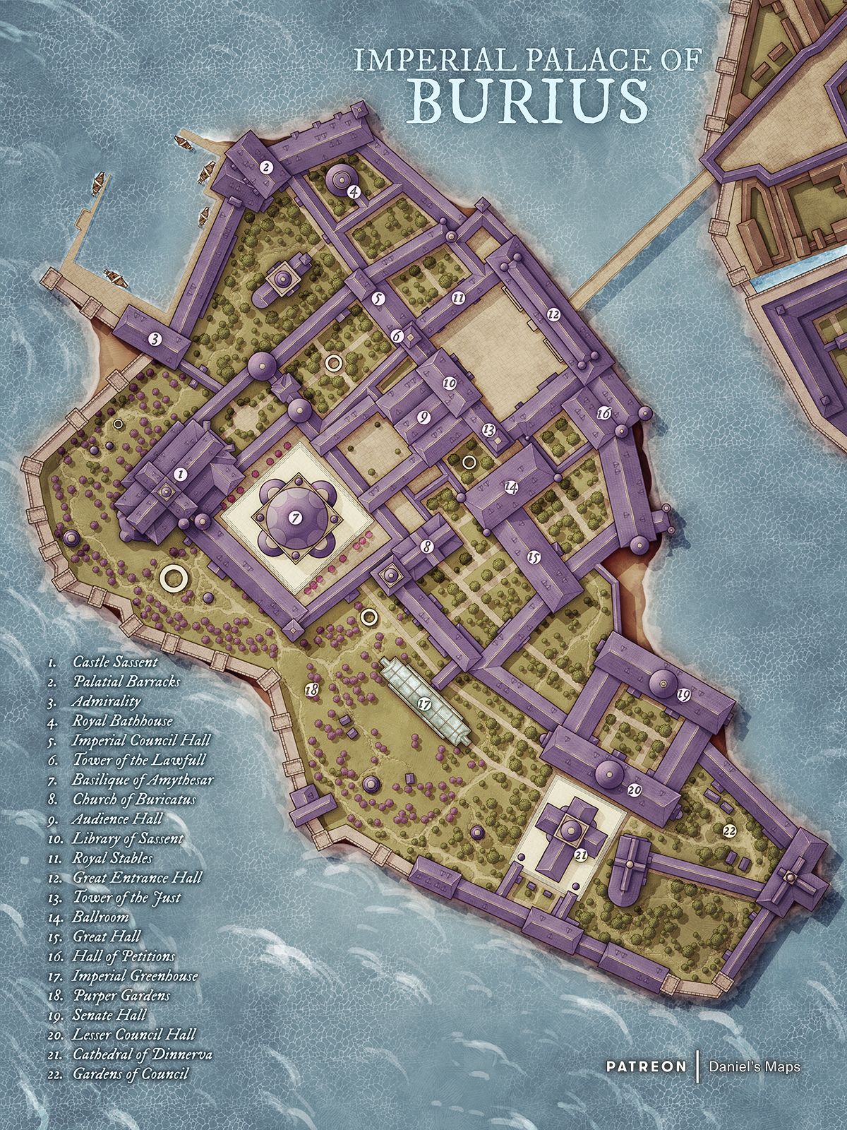 Such a mighty state required a capital worthy of its power, a place from which the emperor could rule. That place was the Imperial Palace of Burius, a vast complex of wings, gardens, and courtyards where the entire imperial court could reside. The palace was larger than most cities and remains, to this day, the beating heart of Burbric authority.