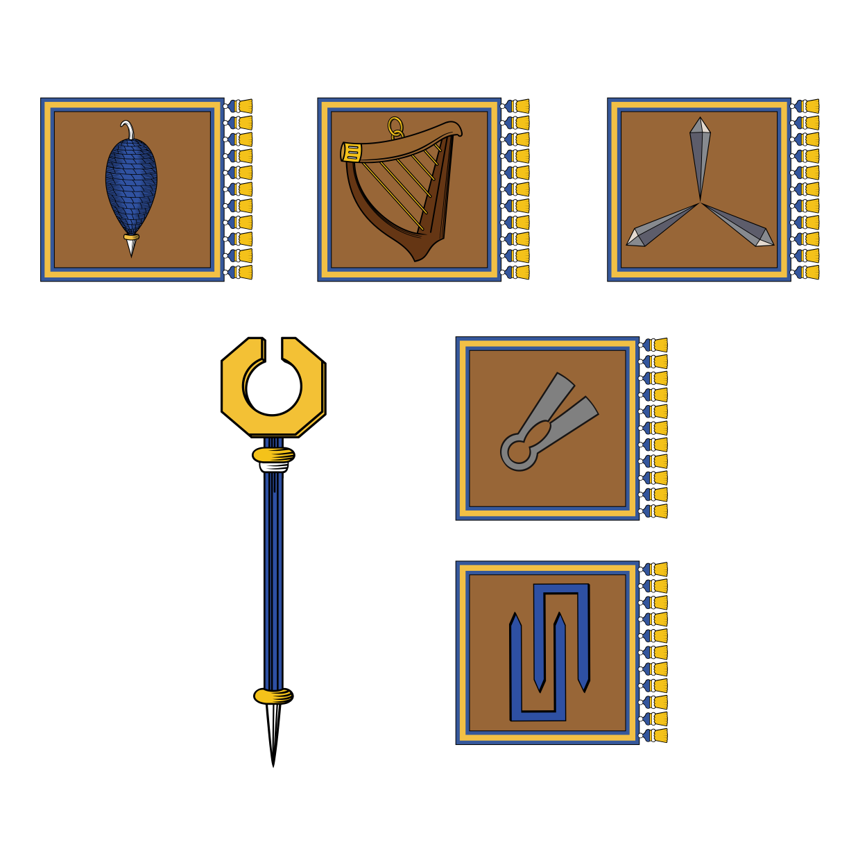 The Great Architects are named due to their hope to build a fantastic nation of significant moneys. The current sovereign is believed to be aided by a magical helm and a secret council. This council is not official and it is generally denied to exist. What does exist is the Order of Craftsman. It uses a series of small flags over it's trade houses and guild houses. Shown below. The staff represents the leader of a given trade.
