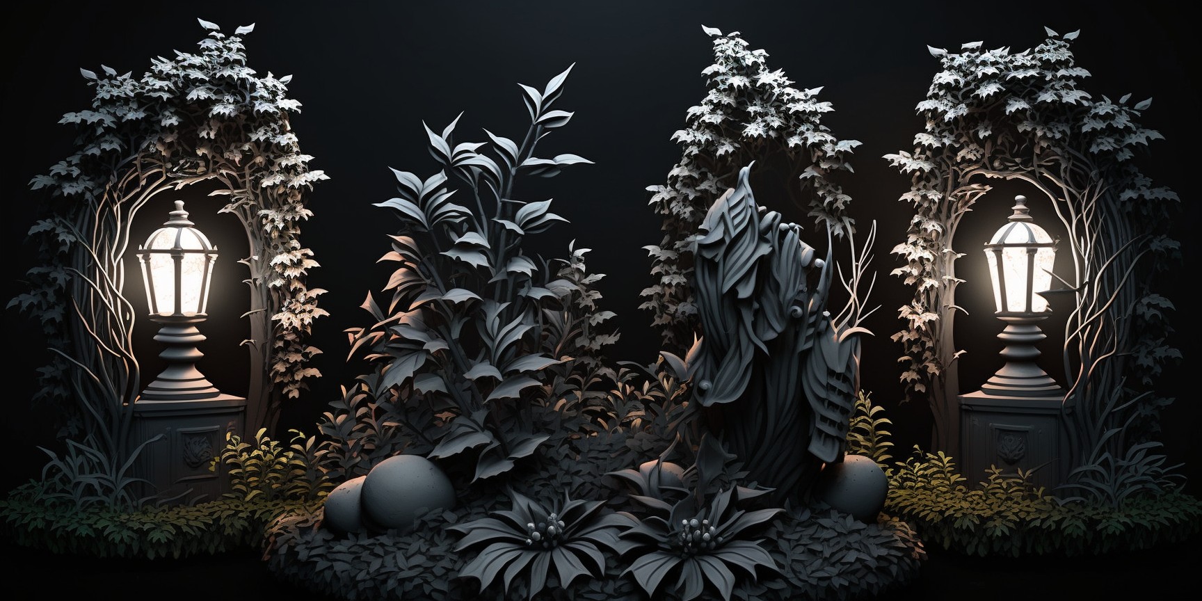 The dark flora grow under conditions where no normal plant would survive due to the lack of sunlight and they have been gifted with a variety of ingenious strategies to overcome this deficiency, some verging on the sinister. All dark flora have black stems, black trunks and predominantly black, grey or red leaves. These are designed to preferentially capture the red lantern lights for which the city is known and to amplify the effects of this feeble illumination to achieve disproportionate metabolic effects via unnatural photosynthetic mechanisms.