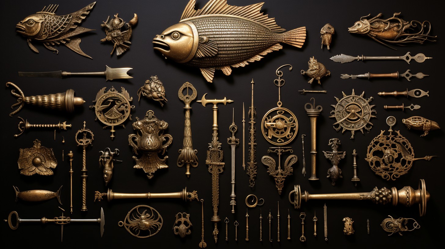 There are numerous items of regalia belonging to the king or queen and in their gift as symbols of authority. Some of these are shown in the image at the head of the article. They all derive from ornate representations of fishing implements or creatures of the river and the sea.