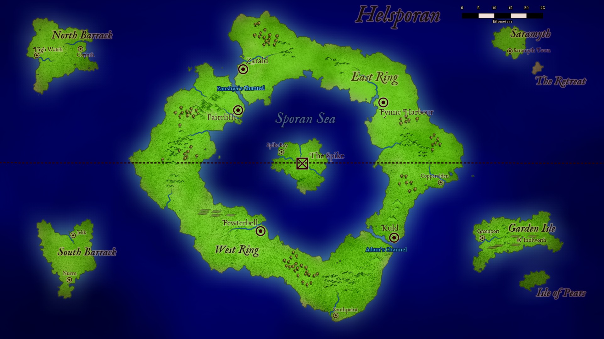 The main ring is split into West Ring and East Ring by the two routes to the ocean and is home to most of the important settlements. Beyond the rings, are some outlying islands which serve as agricultural land and military bases for the robotic forces that enforce the Pax Helsporan.