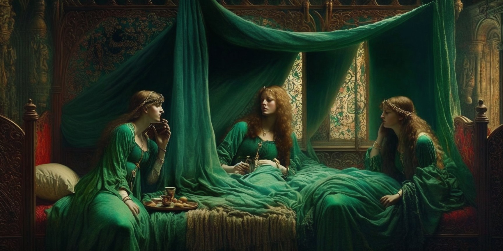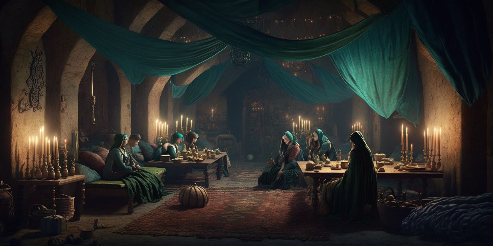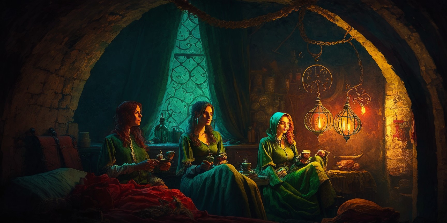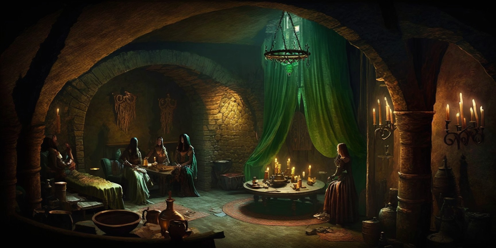 The Verdant Salon is a room for conversation and a place where some of the more musically gifted girls can sing and play with harps, flutes and lutes. There is also a stage for dancing and gaming tables which can be used for cards, dice and gambling of many kinds.