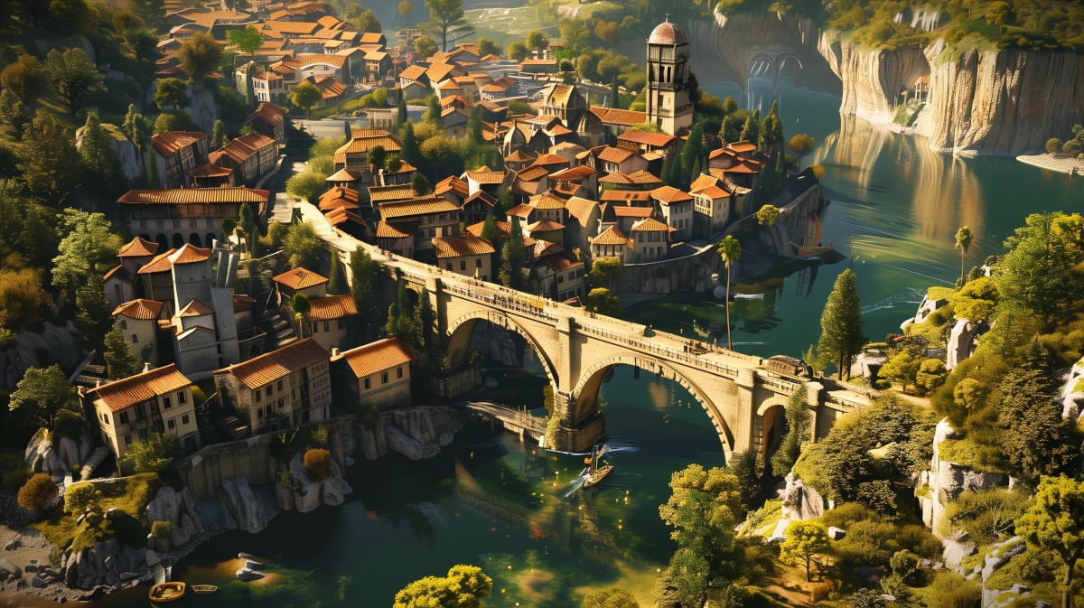 Motrille Bridge is a town in the north and east of Myruthea built around the bridge on the Old Pale Empire Road which crosses the Lower Motrille River close to the point where it emerges from Lake Oxylium.
