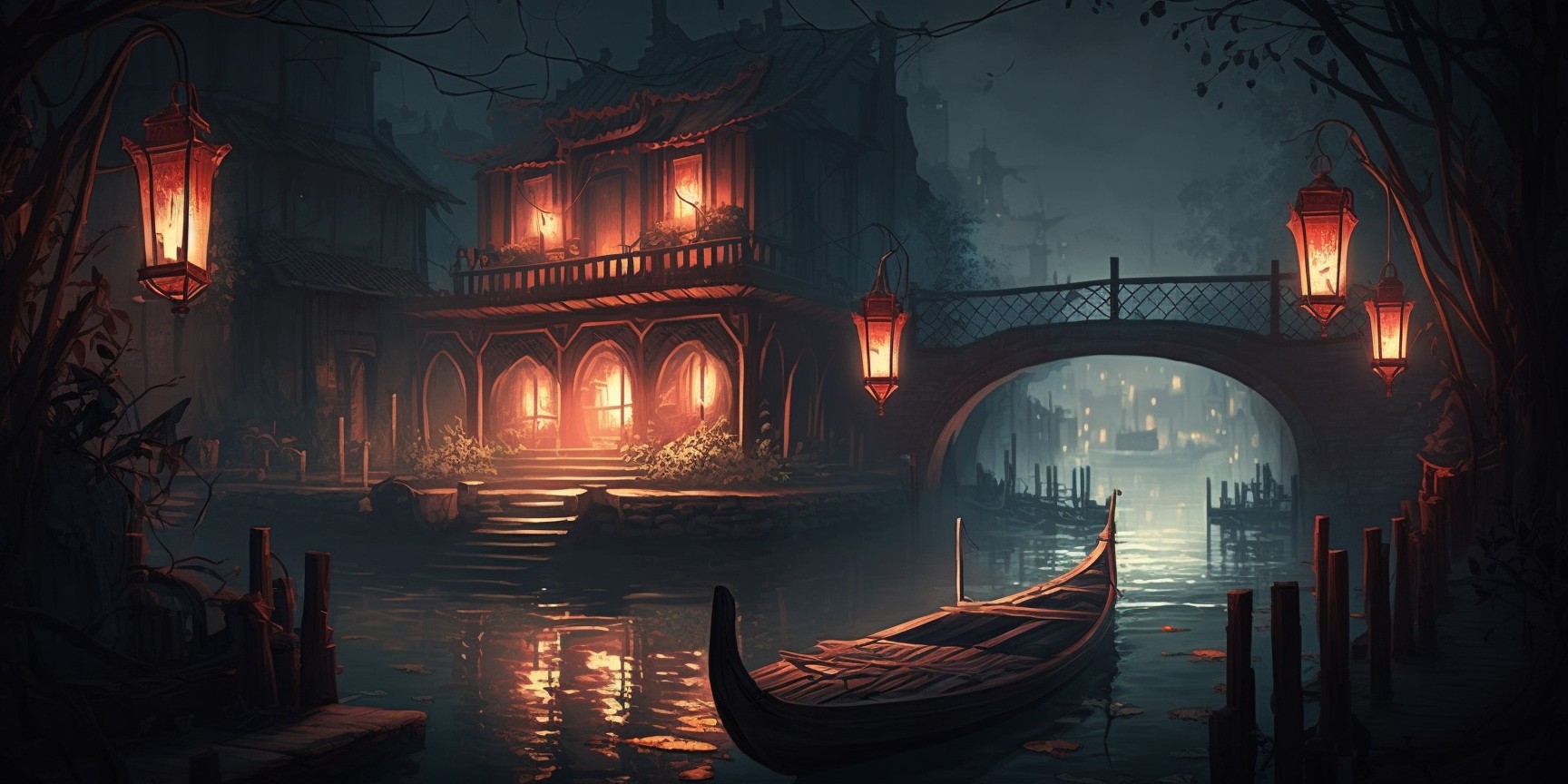 The large building stands on a wharf on a western spur of the Market Canal, not far from the Wet Market, a convenient location, close enough to the market to attract trade, but just far enough away to be a retreat from the hustle and bustle of market business. It is easily reached on the water or on foot.