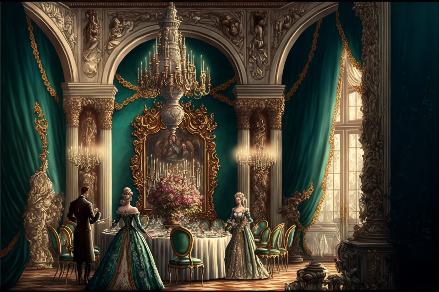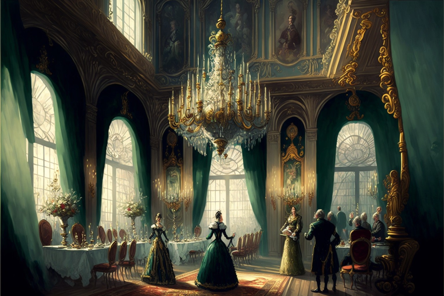 In the illustration at the head of this article we see one of the family rooms in the Tsaritsyno palace south of Moscow, where the Tzar holds court in the winter months. The palace is famous for the lavish entertainments which are held here, including a number of banquets to celebrate the feast days of the saints and elaborate balls, with much music and dancing. The image below shows the "green" dining room at the end of the south east wing of the Tsaritsyno palace, as the sun from the terrace gardens begins to warm it in the morning.