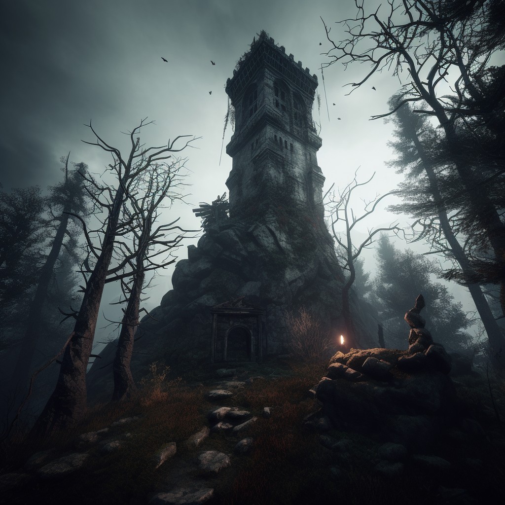 The tower, when they reached it, rose up through a break in the trees to reveal grey clouds. A solitary yellow lamp illuminated a heavy and intricately carved wooden door.
