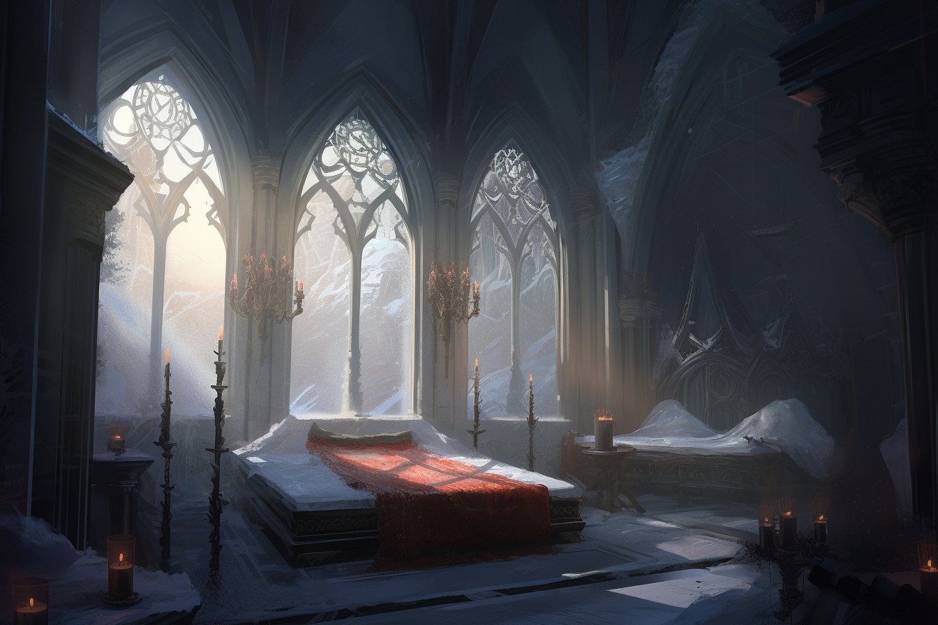 The Mage King had a suite of luxurious rooms in the main keep of Iceholt, which included the grand bedroom shown in the image at the head of the article. Fires were always kept blazing in these rooms which offered excellent views out into the fortress and over the pathway through the bleak lands beyond to the Axial Tower.