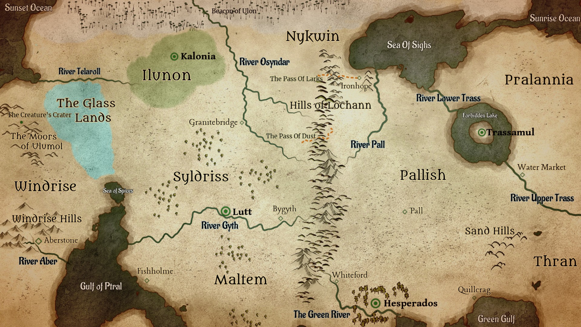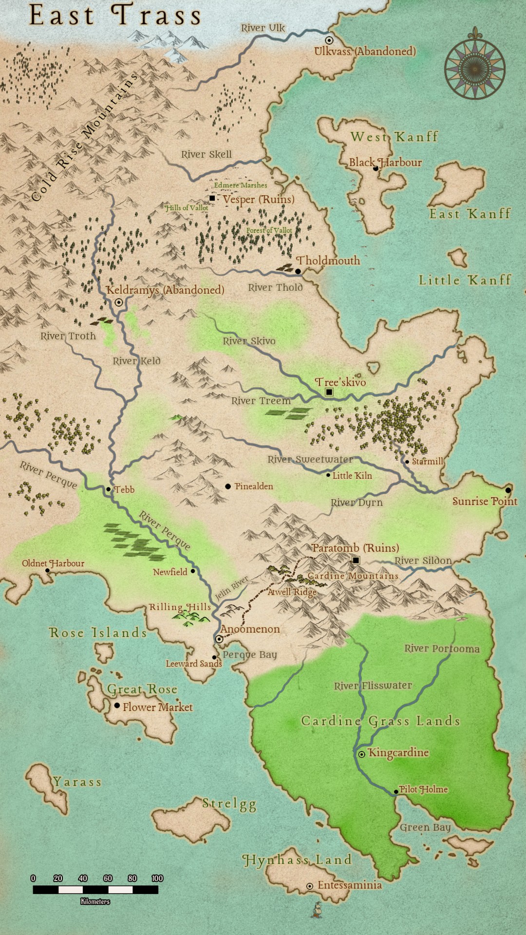 In later years, the centre of power and population would move to the east, and the north eastern region in particular, which is the home of the Foundation Cities of Anoomenon, Paratomb and Vesper with a number of other important cities from later ages, the most noteworthy of which is Kingcardine, the capital of the House of Thorns during the time of the Succession Empires.