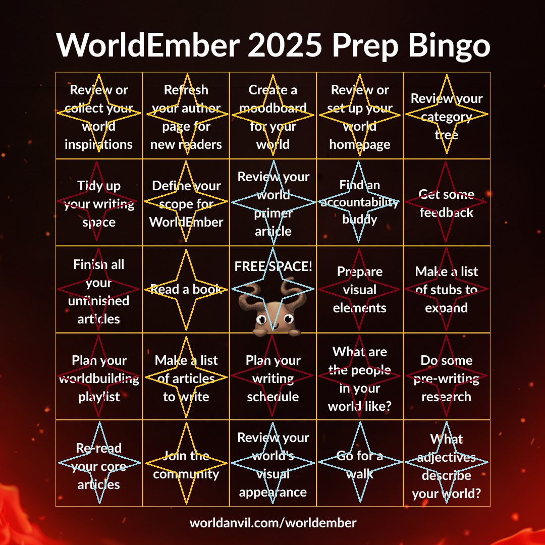 And that is, shockingly, everything on the bingo! Thanks again to everyone who was so supportive and encouraging in the discord server, both in regards to WorldEmber prep and general worldbuilding advice. I've been trying to put together a skeleton of a timeline regarding historical events and got some really good advice on putting together calendars. Apparently I am not the only person who struggles with that.