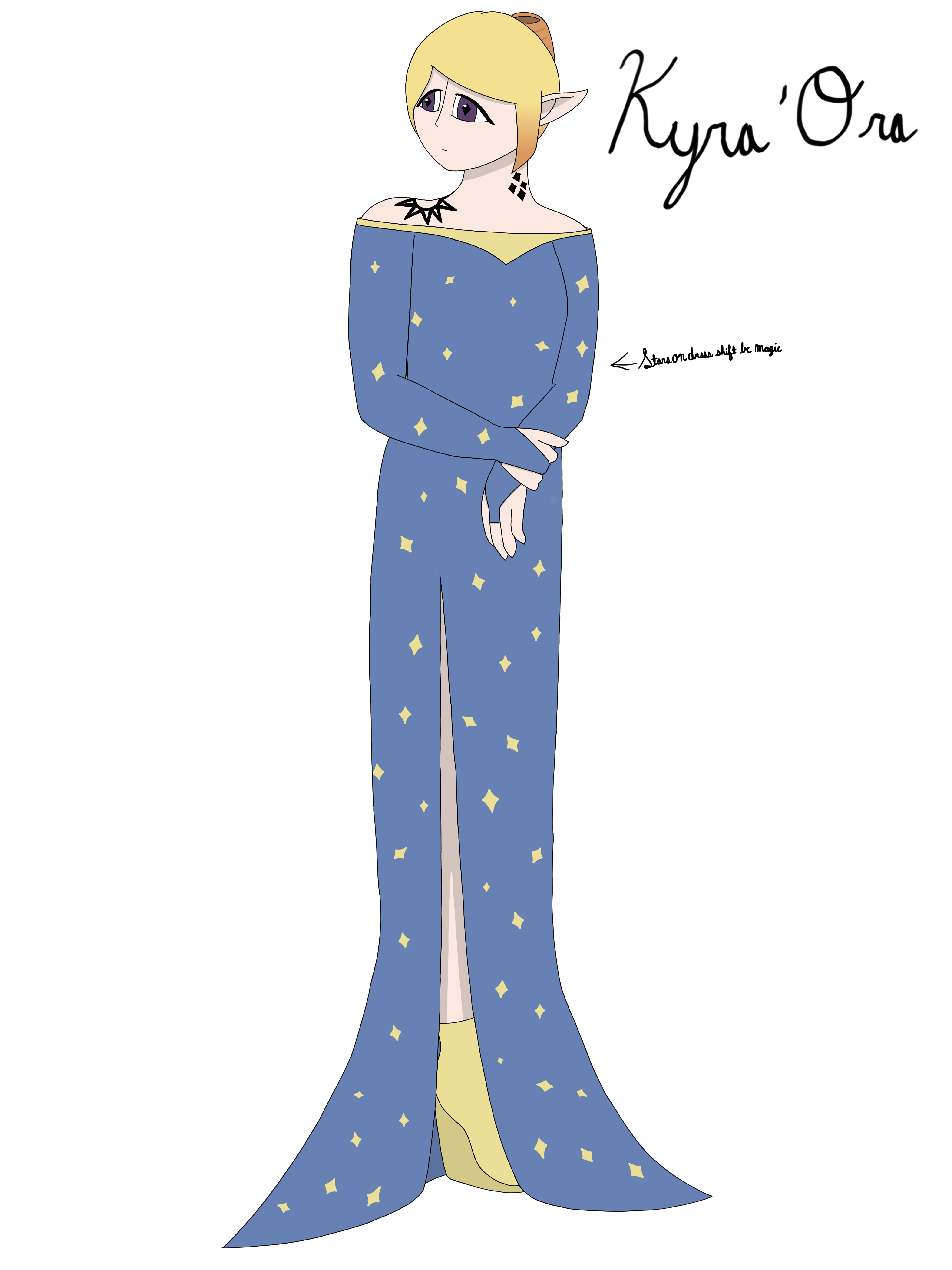 Kyra'ora wears a blue dress with shifting stars on it. Like some other gods, she also wears shoes made of starlight.