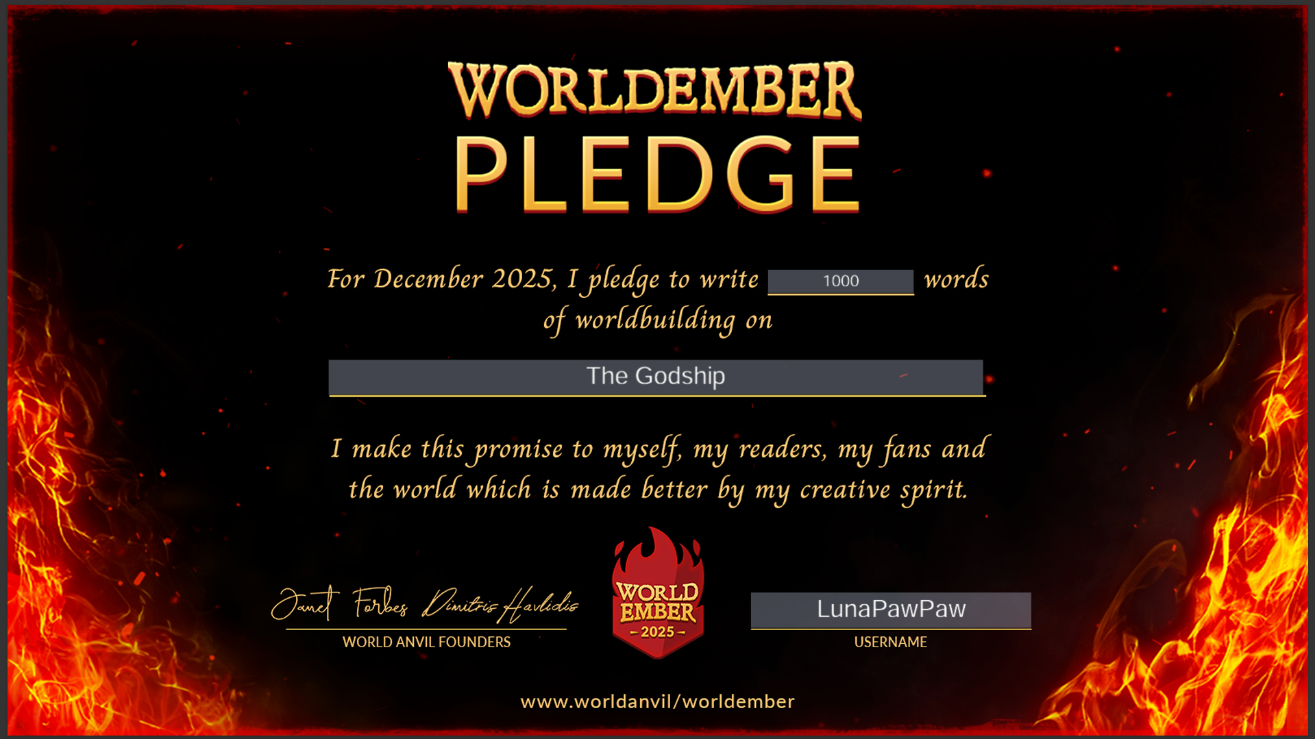 2) Goals I've completed: Make a list of articles you want to write (There are over 100 gods I desire to place in the godship, along with their individual things, some species characteristics, and, of course, descriptions of the actual godship itself. Safe to say this is going to take more than just Worldember, haha) ; Plan your writing schedule (To begin, at night at home because I think my laptop will explode if I try to use World Anvil on it, and then as much as I can on days I don't have to leave the house, exempting Yule, I'll take a break that day) ; What kind of people can you find in your worldbuilding area? (Gods, mostly. It is the godship, after all. There is, however, the occasional visiting mortal) ; Do some research about the topics you'll write about (Considering it's worldbuilding some pretty high fantasy, so much so that most of these gods don't even resemble humans in their true forms (and some don't in their more humanoid forms), I'm not entirely sure how to do this, especially considering I don't yet know the worldbuilding prompts, but I did a bunch of research about the aurora borealis, just in case I can weave some more aspects of Aurora into the worldbuilding) ; and plan your worldbuilding playlist (I spent about two hours building a playlist of all the songs I've imagined my characters to, and it is 267 songs at the moment, and I think that should probably be enough for the time being. Even if I can't cover all of the gods with those songs, at least a lot of them will be able to slot their ways into songs; there should be plenty of variety.) . And that makes one bingo. I will update this if I choose to do a second bingo.