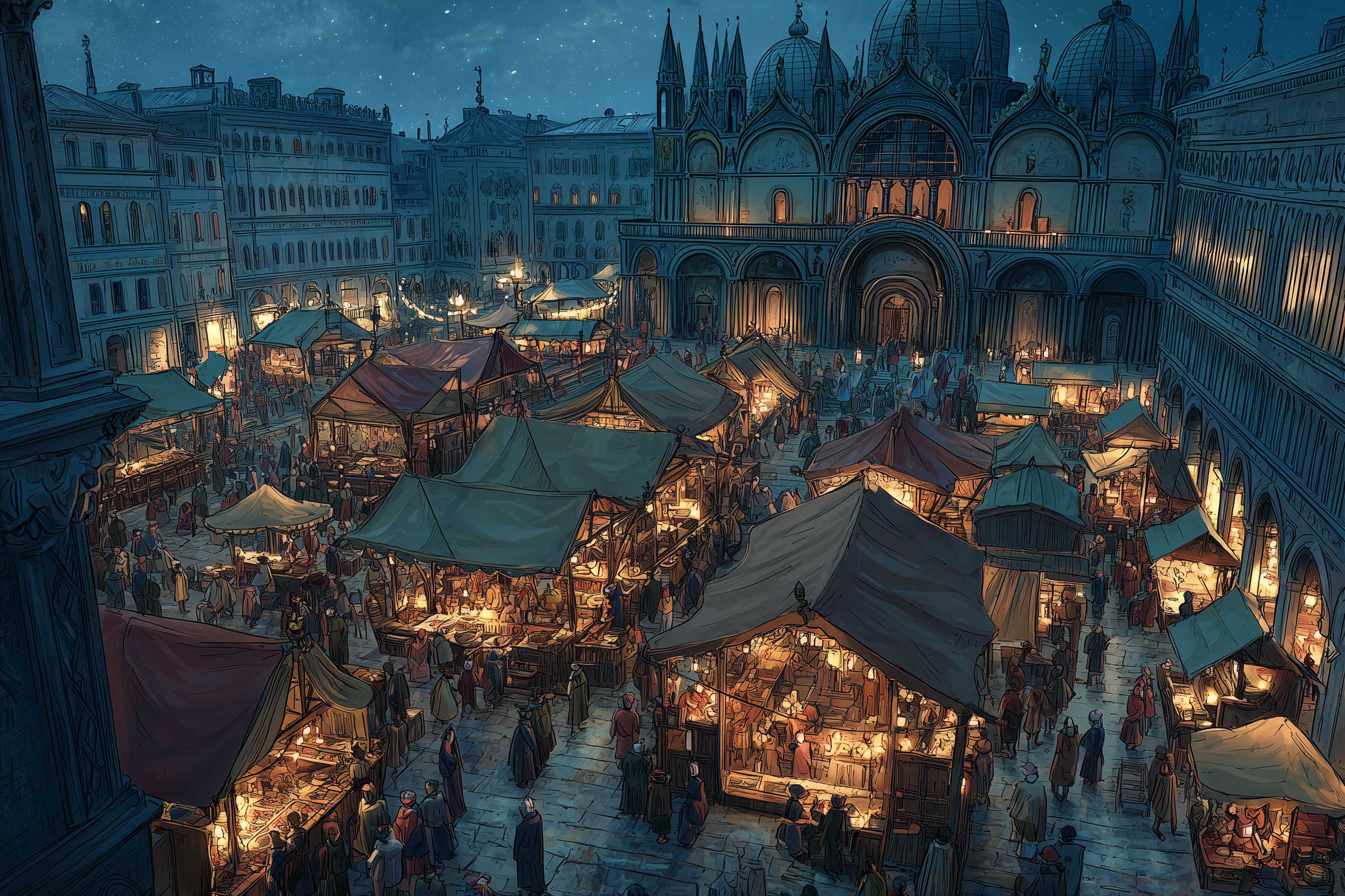 Nestled on the eastern bank of the Grand Canal, the Mercato di Rialto is the economic soul of Venice. Established over centuries and thriving by 1400 AD, the market bustles with color, scents, and voices by day — and becomes a very different place once darkness falls. It is here that Venice’s wealth flows in like the tide: spices from the Levant, silks from Byzantium, fish from the lagoon, and gossip from every corner of Christendom.