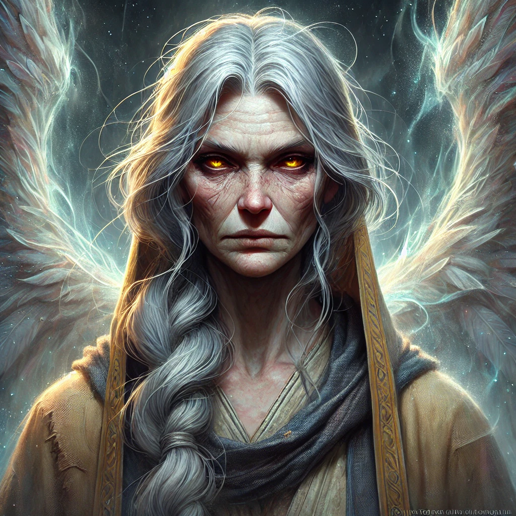 Azreal has adopted the appearance of a frail, elderly human woman. She uses this guise to navigate more freely and fool what she believes to be the minons of the necromancer. Although her plans fell apart when she realised she had been captured by a dragons servants. While still capable of radiant magic, Azreal now uses it sparingly. Her strength is no longer infinite. She now needs the aid of others, asking for help from kind mercenaries to help track down the necromancer and the necronomicon. Although she requires help, she seems to reveal her true self to only a few.
