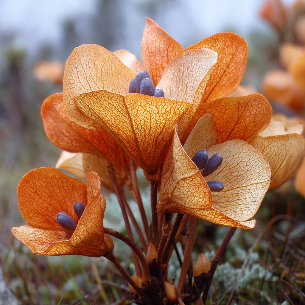The Amber Bell, Campanula lucida, is an elegant adaptation to desert survival, having evolved translucent, amber-coloured petals that function as living greenhouses. Each petal captures and concentrates sunlight while filtering harmful radiation, creating perfect micro-climates for the plant's reproductive organs. The delicate network of veins that are visible through its translucent flesh provide both structural support and nutrient distribution that glows like captured sunlight.