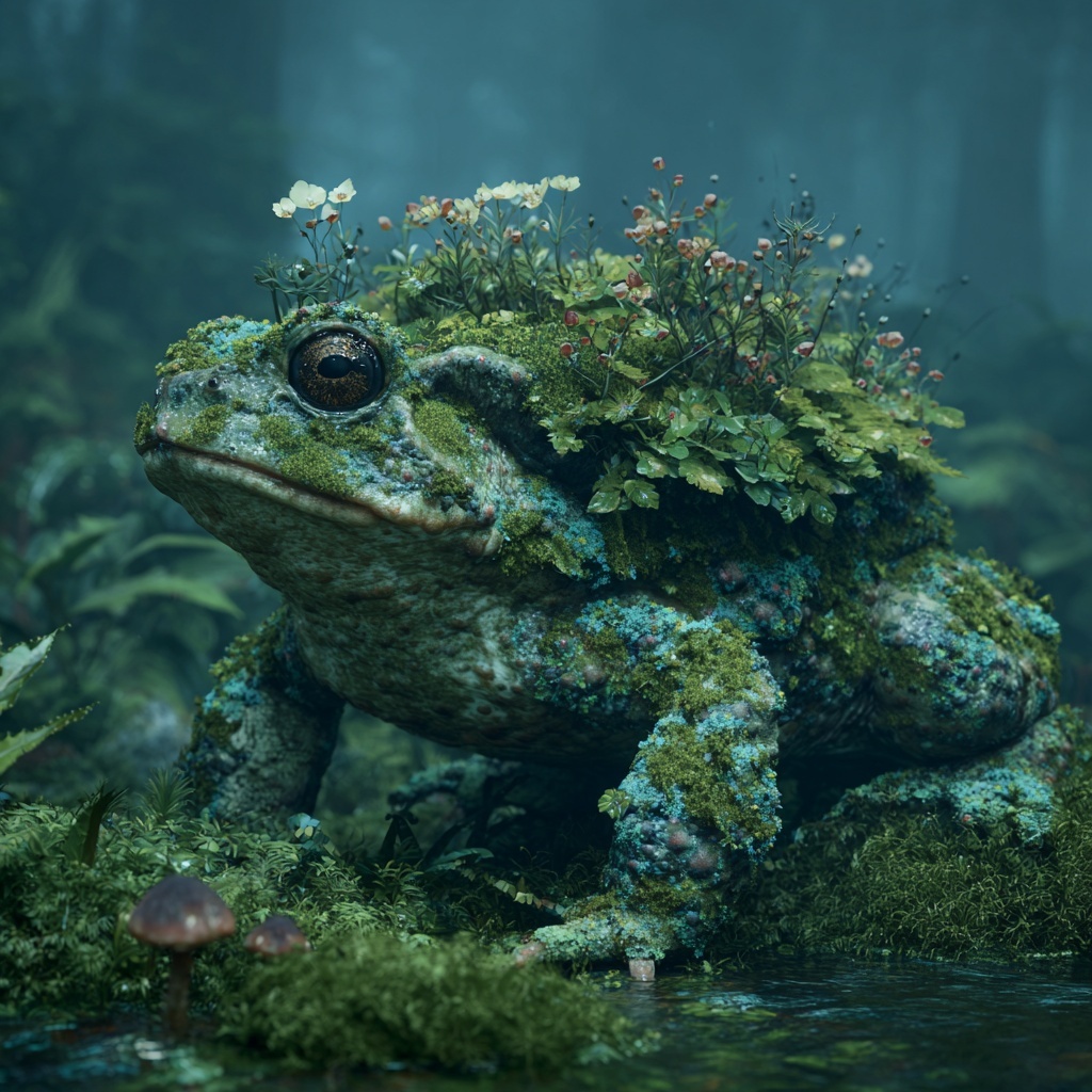 Its deep, resonant call echoes across the wetlands like the territorial boom of traditional bullfrogs, but the vibrations help to distribute pollen from its garden crown, while communicating with potential mates about the health and diversity of their botanical partnerships. A Bloomfrog with particularly lush and varied botanicals commands respect and attracts the most desirable partners.