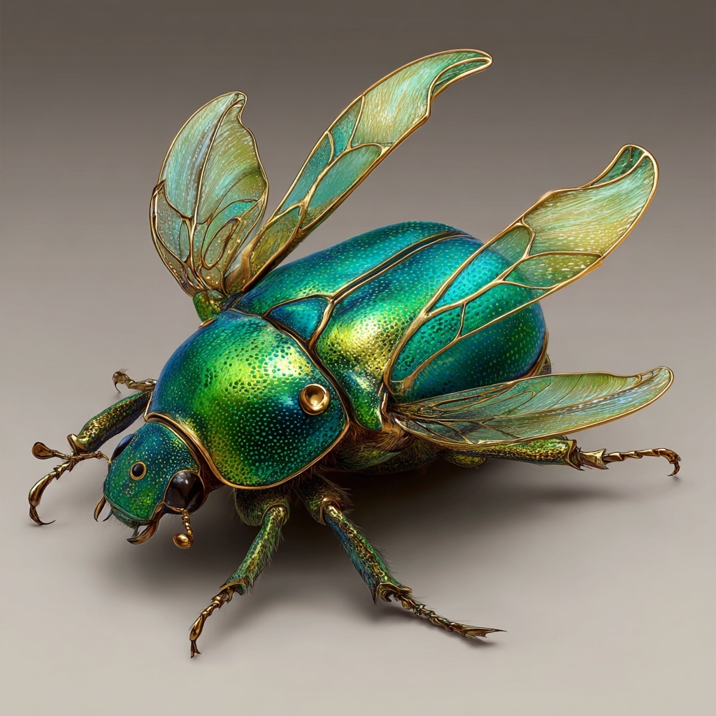 The Gilded Sphinx, Scarabaeus aurifex, has evolved specifically to serve as the exclusive pollinator for the rare Amber Bell plants. Its exoskeleton has developed an extraordinary iridescent quality that shifts from deep emerald to brilliant turquoise, creating a living jewel that rivals the translucent beauty of its botanical partner. This colouration and metallic sheen reflects the desert's harsh solar radiation, while the specific wavelengths help it to locate the nearly transparent Amber Bell flowers across large distances.