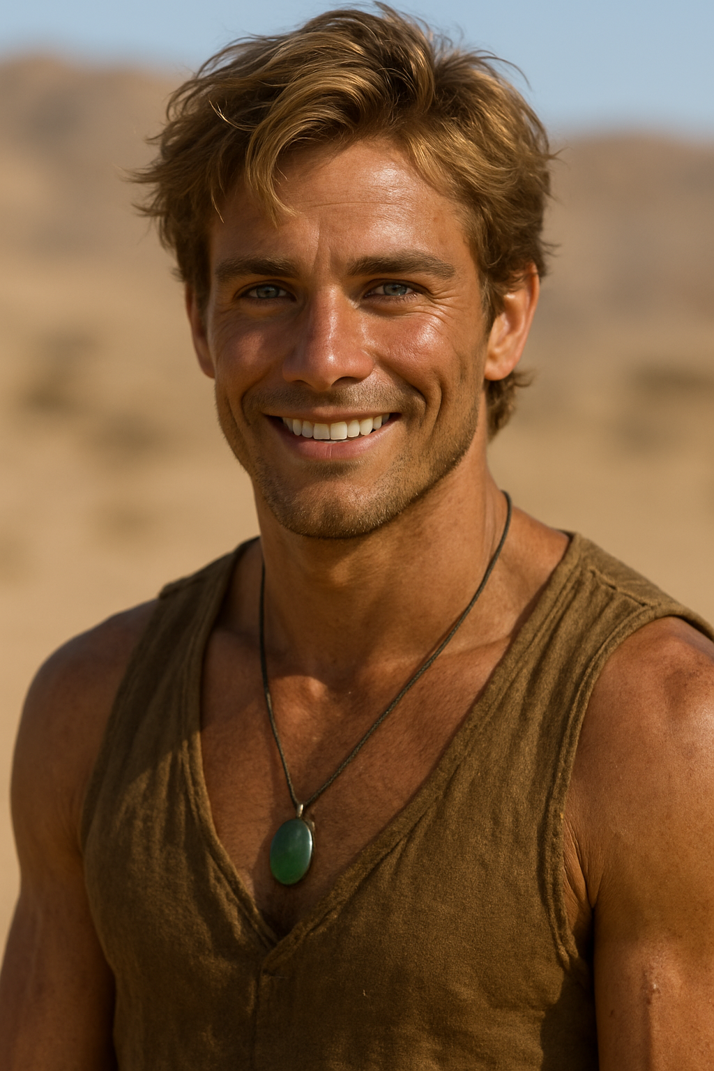 Mika is the kind of person who feels inseparable from the desert itself. He’s tall and sun-toughened, with skin weathered by wind and salt, shoulders broad from years of survival work, and hair bleached into sandy waves by the relentless Mojave sun. But what makes him unforgettable isn’t just how he looks—it’s the way he carries himself. Mika moves with a quiet certainty, as if he’s listening to things the rest of us can’t hear: shifts in the wind, whispers from plants, the warnings of storms before they arrive. There’s a gravity to him, a natural pull that makes people trust him without needing words. His emerald-green eyes hold the kind of life and abundance the salt flats deny, and when he looks at you, it feels like being seen by something both human and older than human. Mika is a protector, guide, and mystery all in one—a man both deeply grounded and just out of reach.