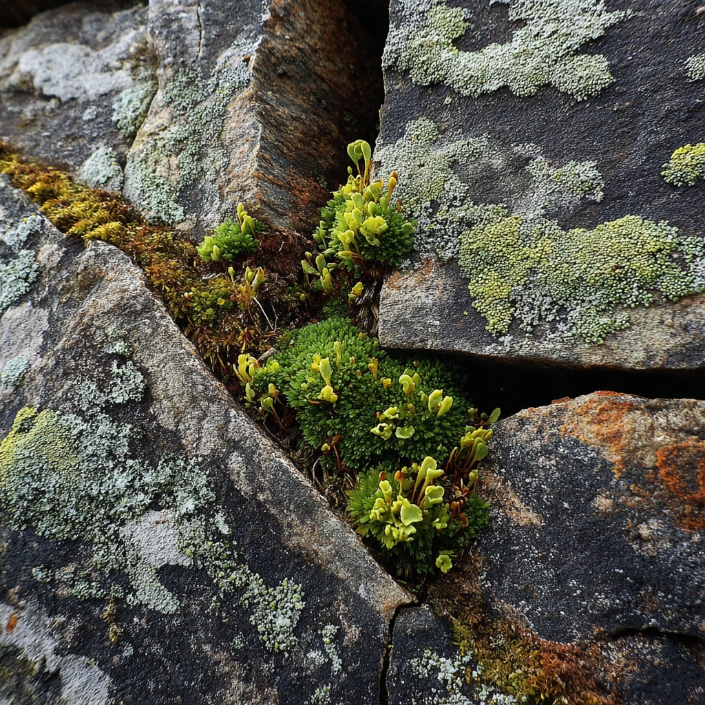 The plant's structure follows the natural fissures and mineral veins in rock faces with unsettling precision, its growth patterns too geometric to be entirely natural. Stone moss forms distinct colonies of varying sizes, from small patches that are no larger than a human palm, to sprawling networks that can span several metres of cliff face. Each colony maintains perfectly circular or oval boundaries, creating the illusion of separate organisms, while secretly combining in a sprawling, underground network connected by thin filaments that bore through stone.