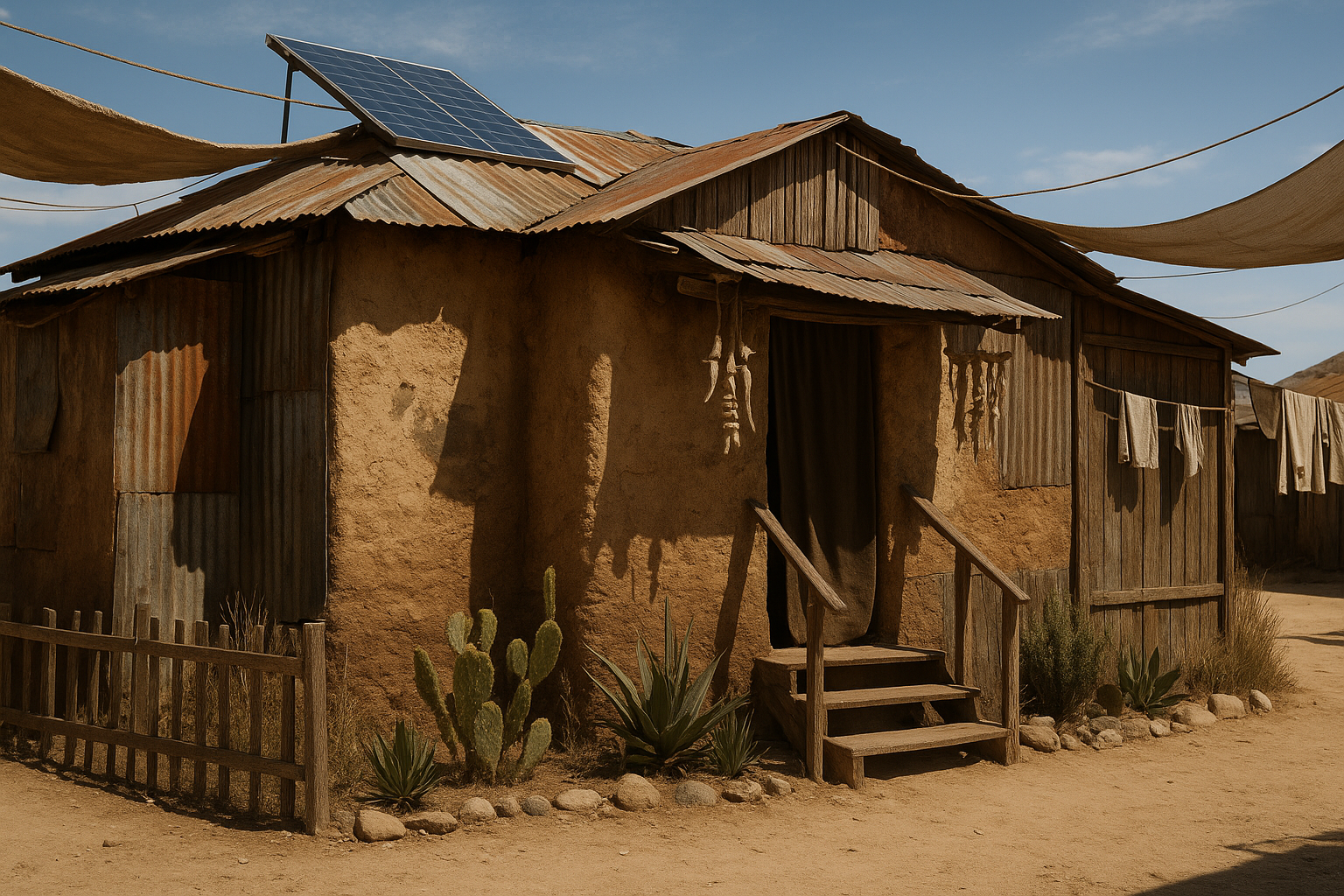 The flat roof is layered with tarps, canvas, and salvaged metal to capture precious dew and rainwater, with channels that funnel water into barrels below. The wooden addition attached to the main structure is clearly newer, constructed from scavenged planks and corrugated metal sheets, its patchwork appearance contrasting with the weathered uniformity of the original adobe structure.