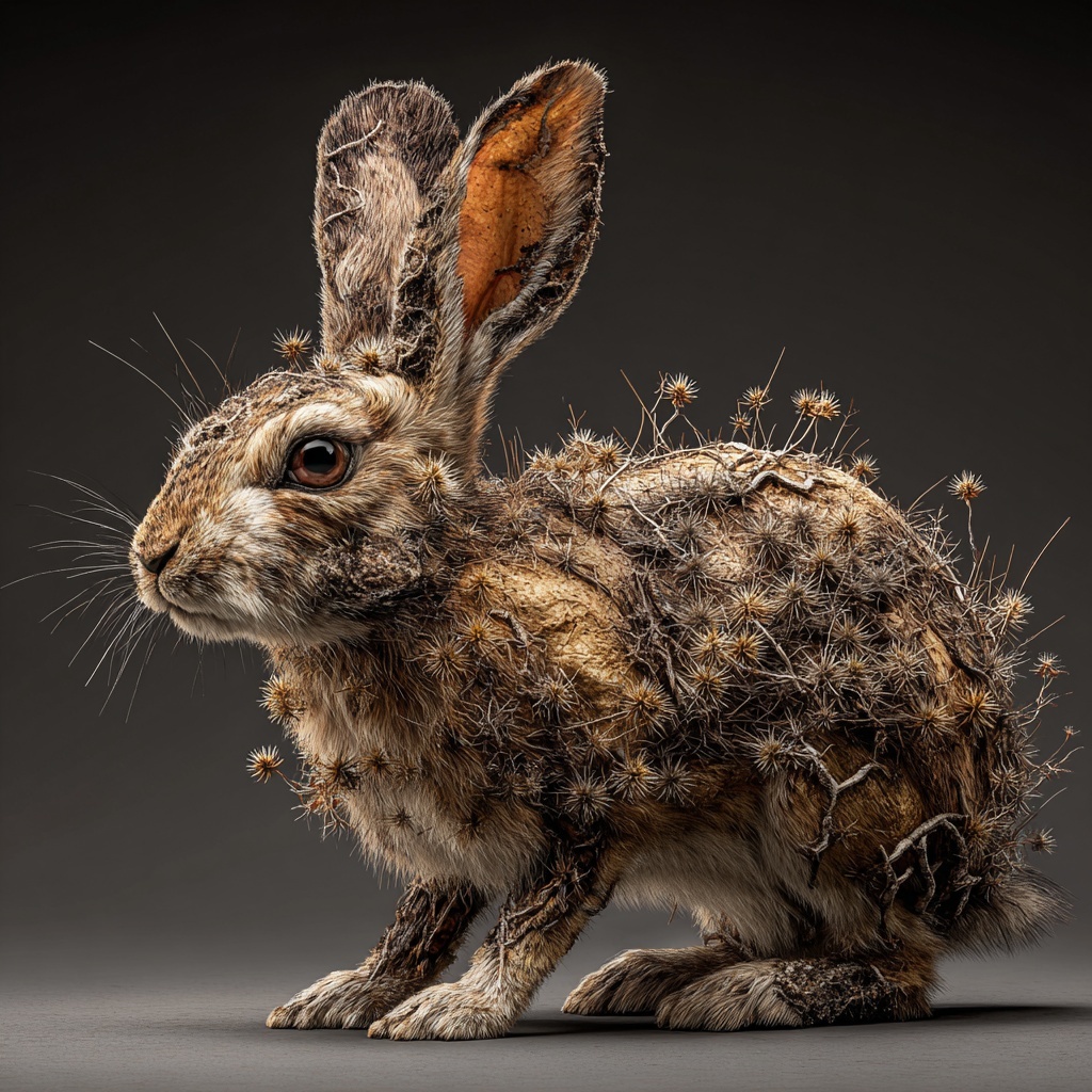 Remarkably, it has retained its essential cottontail nature, despite these drastic modifications. It moves with the quick, nervous energy of its ancestors, feeds primarily on desert vegetation, and still reproduces through traditional mammalian means. However, its young are born with soft proto-spines that harden and develop their botanical symbionts only after several weeks of nursing—a complex maturation process that bridges purely animal and hybrid plant-animal development.
