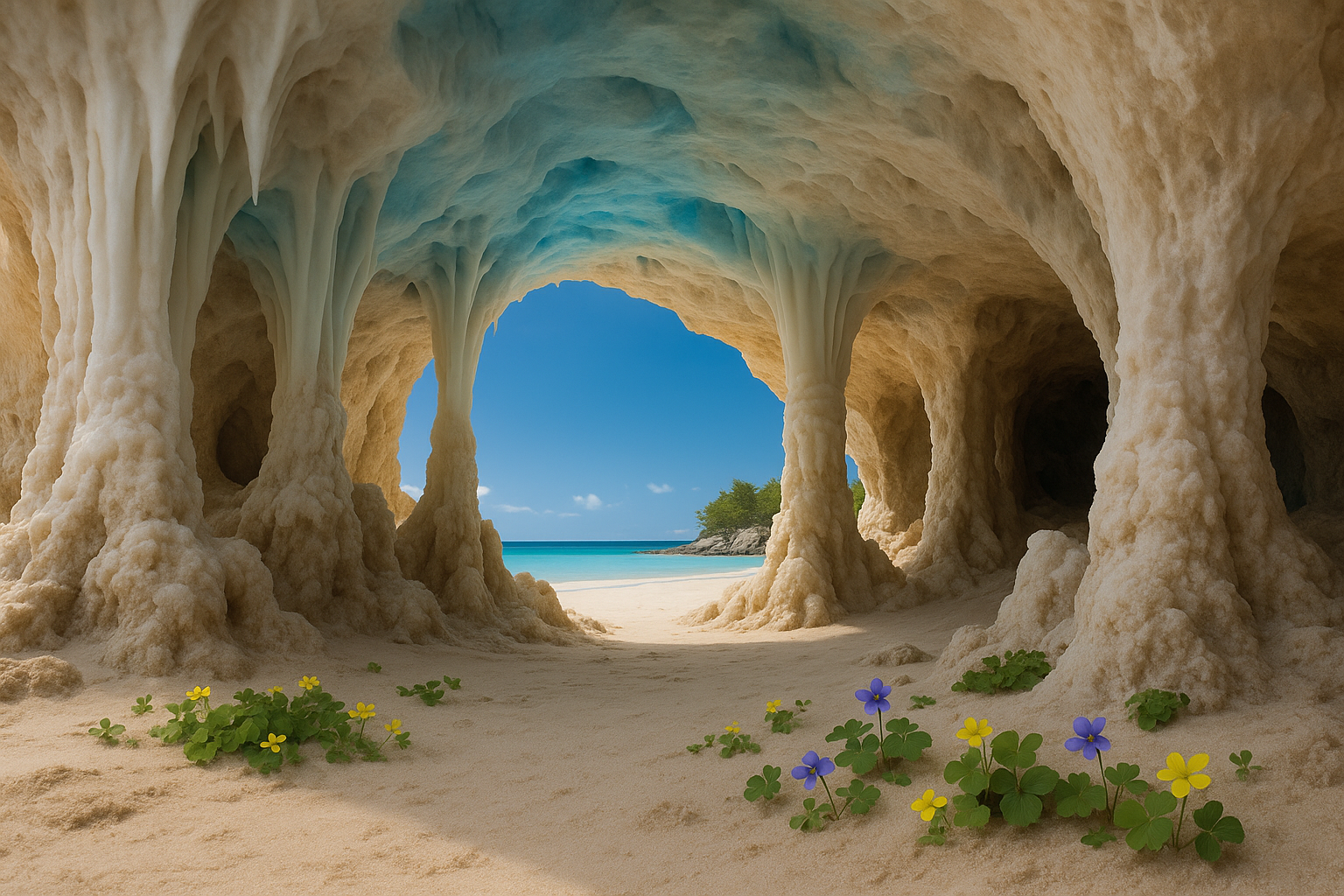 The caves of Haruna lead out onto the sunny, golden, sandy Harunan beaches. The main section of the Haruna network consist of beautiful sandy caves, with elegant stalactites and stalagmites protruding from the floors and ceilings. Where the sunlight pours in, the caves are brightly lit, the different types of stone causing the light to bounce off in various hues. As you get deeper into the caves, will-o-wisps light the way, creating an atmosphere reflective of the stars dancing in the night sky.