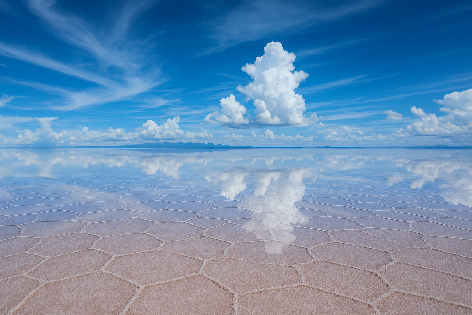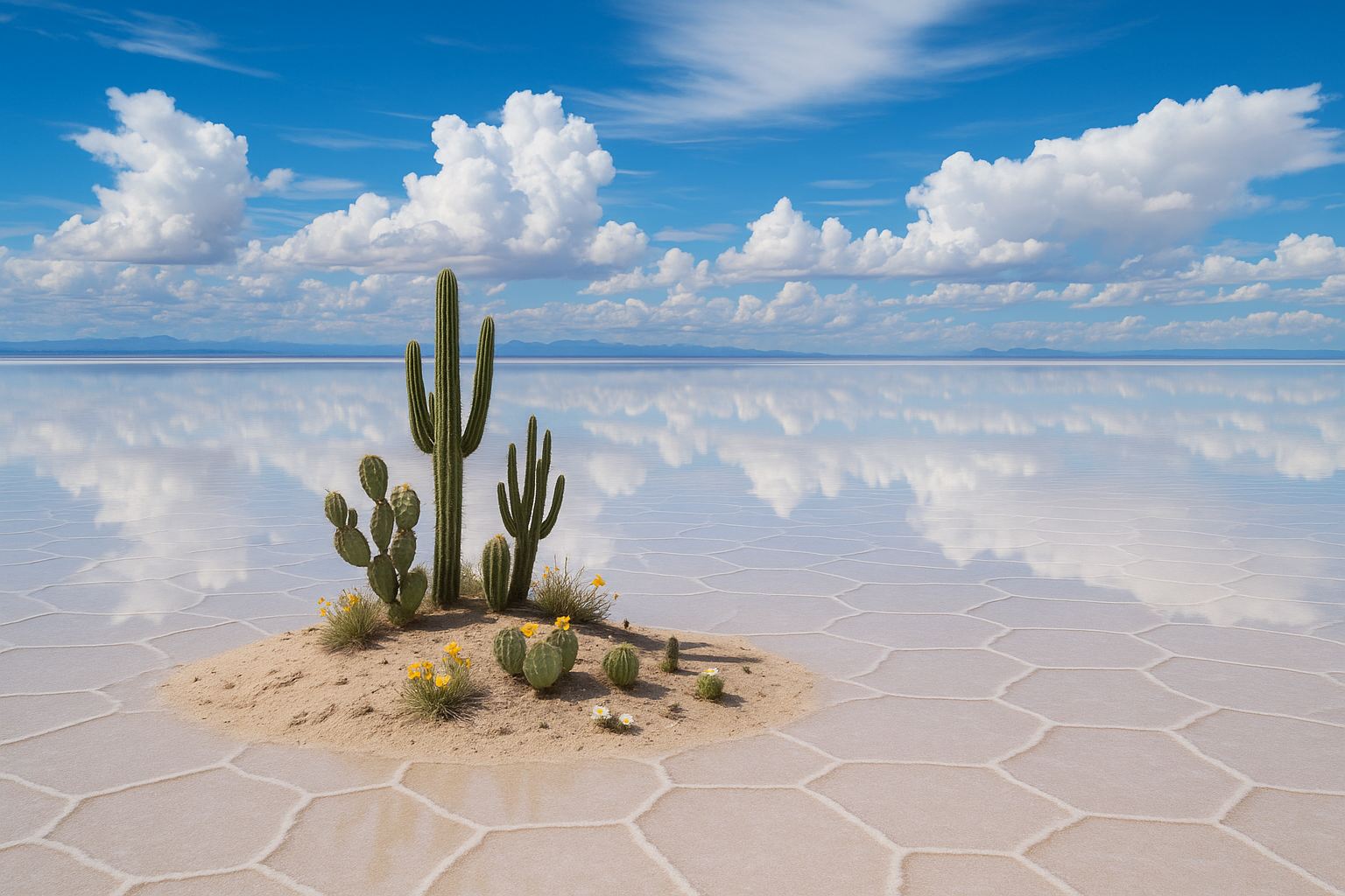 The Simekian Salt Flat is an immense, barren landscape of salt pans stretching across the horizon. The vast, cracked salt crust forms intricate geometric patterns, most notably hexagonal formations, that create a mesmerizing, otherworldly landscape. When rare rains do fall, the flat becomes a reflective mirror, blurring the line between earth and sky. Scattered islands like Cactus Island, which rises from the salt crust, provide temporary relief from the desolate salt flats, offering pockets of life and shelter from the overwhelming glare of the sun.