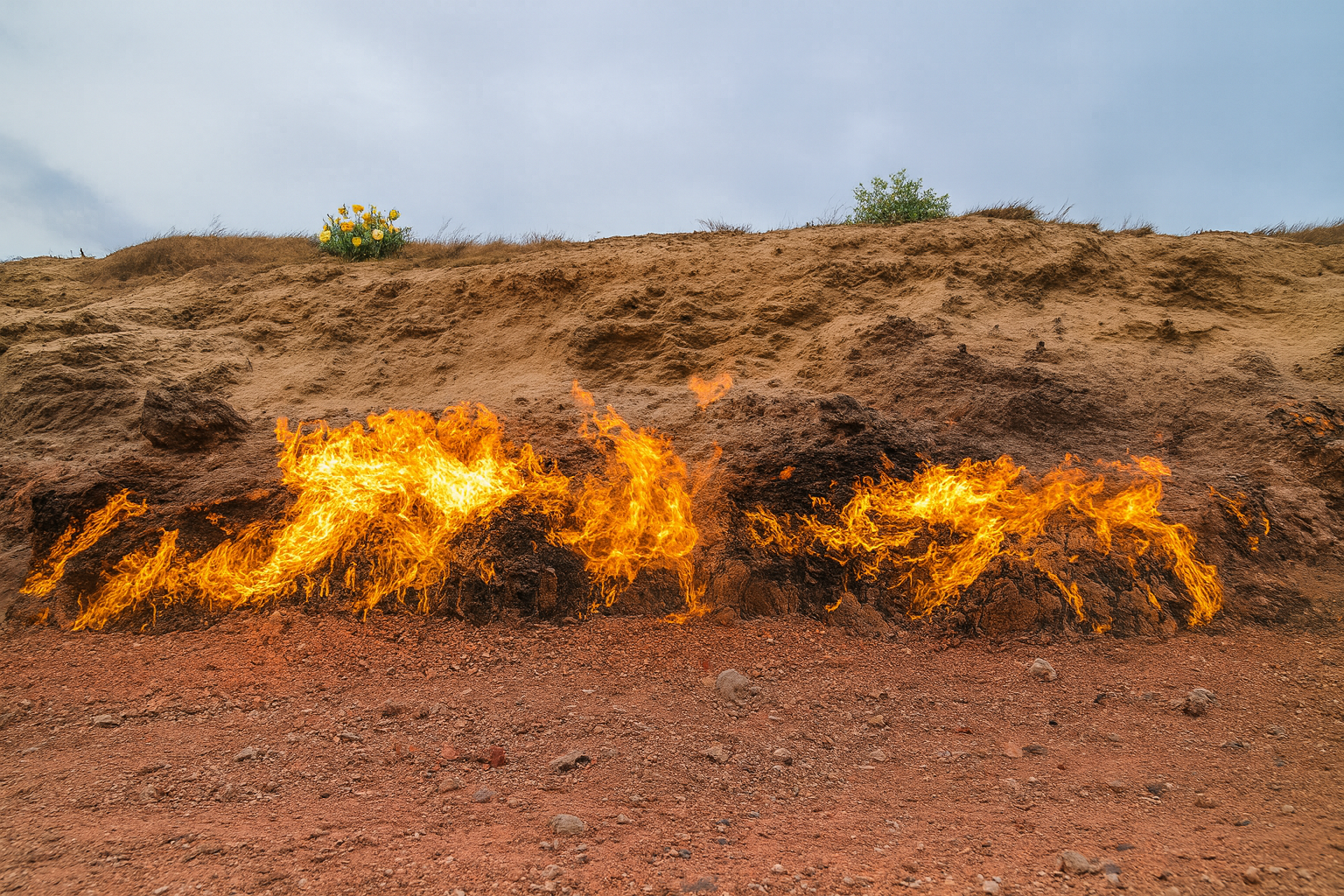 The region is rich in natural gas deposits. The gas seeps through cracks in the earth and is ignited by spontaneous combustion, creating the continuous fire. The fire has been burning for several decades, if not longer.